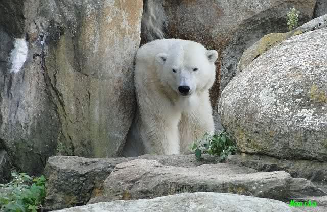 Die Fütterung fiel für Knut heute sehr mager aus. Viel hat er nicht abbekommen. Die drei Damen hatten keine Lust ins Wasser zu gehen, um ihr Futter zu holen. Sie warteten lieber gleich, bis Knut gefüttert wird. Der Pfleger hat wohl heute kein Zielwasser getrunken und so viel das meiste auf die Felsen und ins Wasser. Es dauerte gar nicht lange, dass Nancy als erstes zu Knut ging. Die anderen beiden folgten und Knut suchte das Weite. Nancy fraß alles auf, was auf dem Felsen lag. Tosca und Kati duchsuchten das Wasser.
