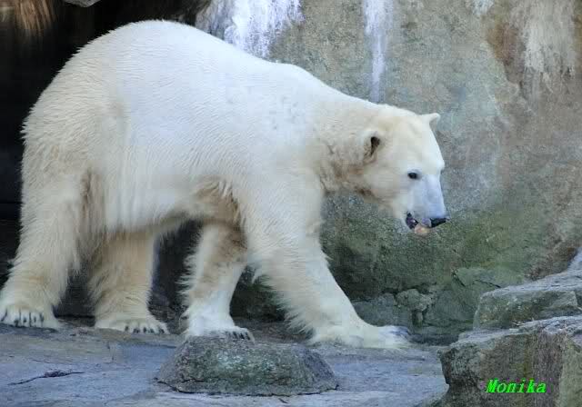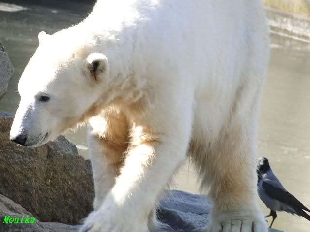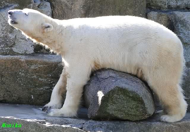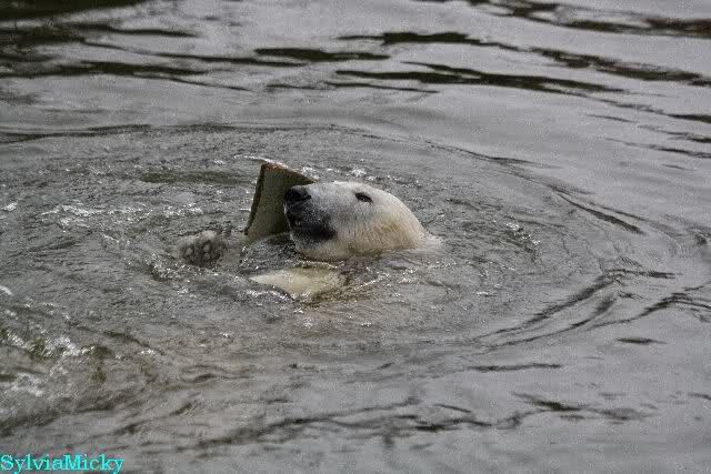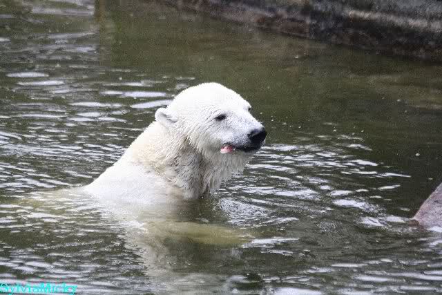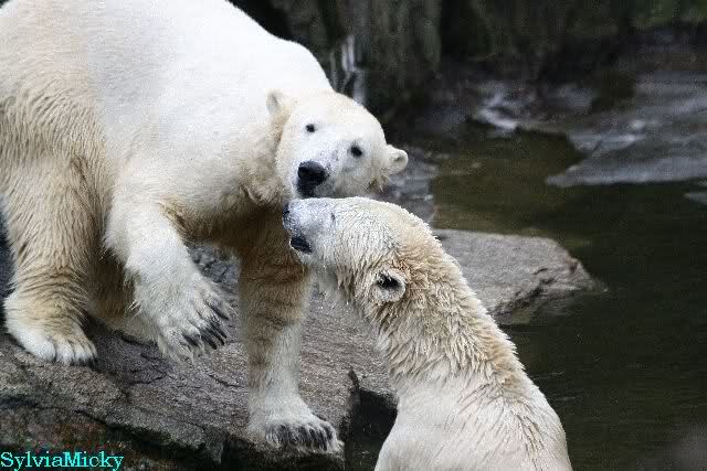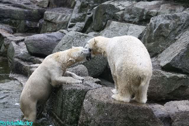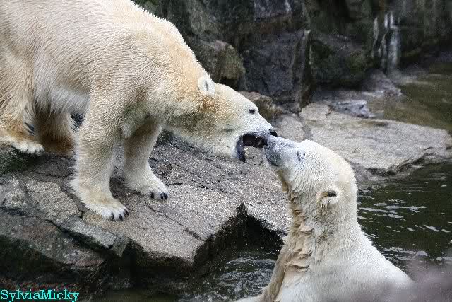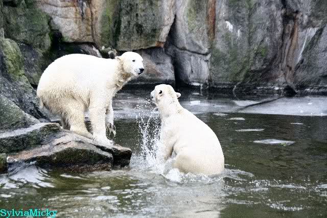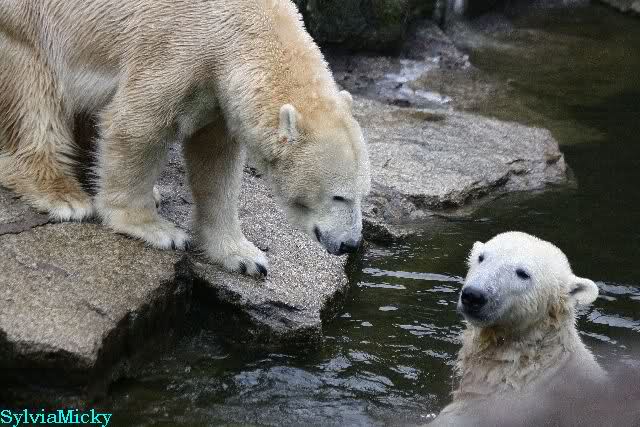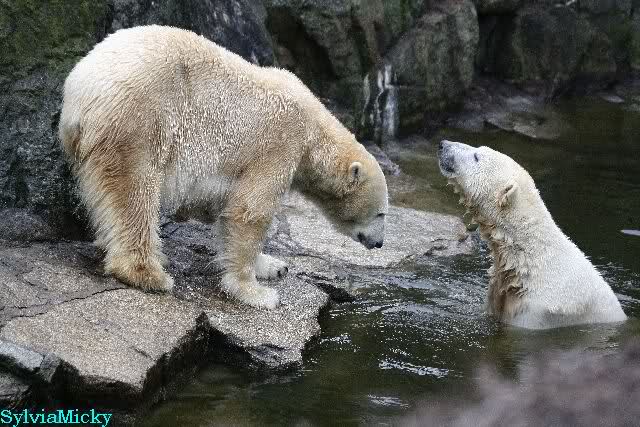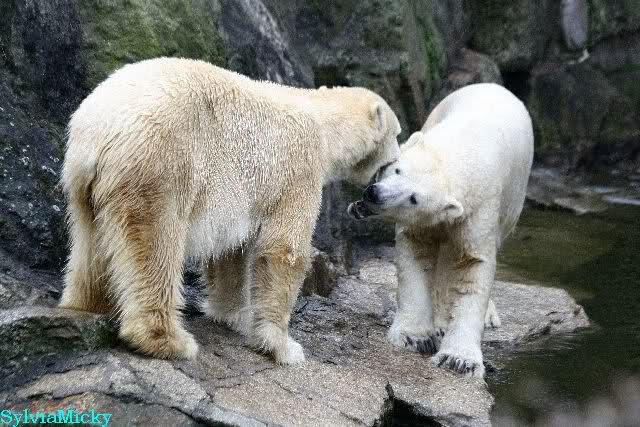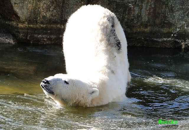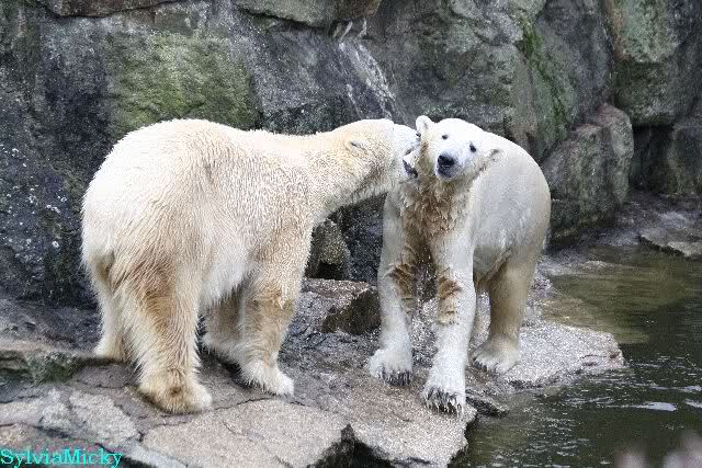 Glück für Tosca, die wieder viel davon abbekam. Aber auch Kati holte sich einige Stücke. Tosca schwamm dann um die Ecke zu Knut und versuchte ihn mit vielen Sprüngen ins Wasser zu locken. Aber irgendwie wollte er nicht. Sie ging dann auf die Anlage und sie „schmusten“ lange zusammen. Dann sprang Tosca wieder mehrmals ins Wasser. Endlich ging auch Knut rein. Und dann tobten sie lange im Wasser. Sie schwammen auch beide an die Scheibe. Sehr zur Freude der Besucher. Nancy beobachtete die Beiden die ganze Zeit. Sie lief ihnen auf der Anlage immer hinterher. Als Knut keine Lust mehr zum toben hatte, ging er auf die rechte Seite. Dann kam Nancy an und sie „schmusten“ sehr lange miteinander. Knut ging ab und zu ins Wasser, als wenn er sie rein locken wollte.