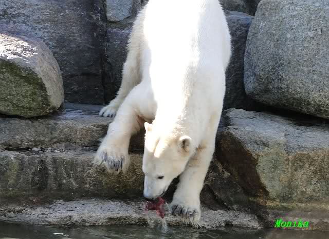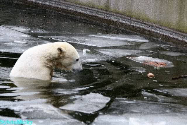 Zur Fütterung bekam Knut nur wenig ab, da das meiste Fleisch im Wasser landete.