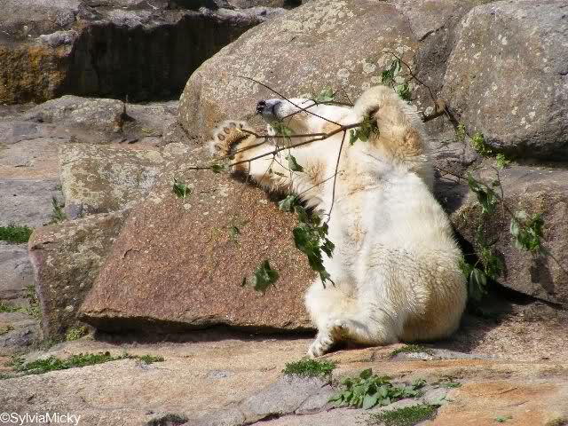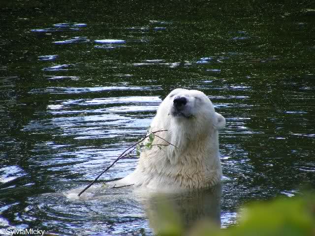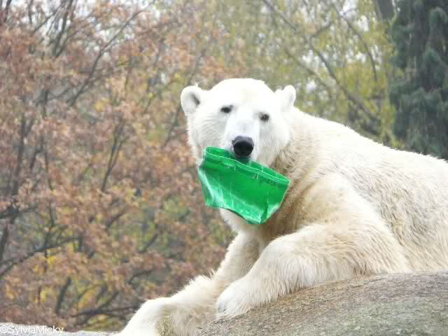 diese Fotomontage sieht aber echt aus. Habe schon einen Schrecken bekommen. Es gab nämlich auch mal einen Tierpfleger, der schwächelte und dem ab und zu ein Eimer aus der Hand fiel. Manchmal, wenn er mit einem Zweig (also Naturmaterial) den Staub von den Blättern an der Anlage fortwedelte, ist ihm auch der hineingefallen. Dann hättest Du mal die großen Eisbären, die nicht spielen wollen, sehen sollen. Sicher wollten sie dann ihren Graben reinigen - mit Eimer und Zweigen.