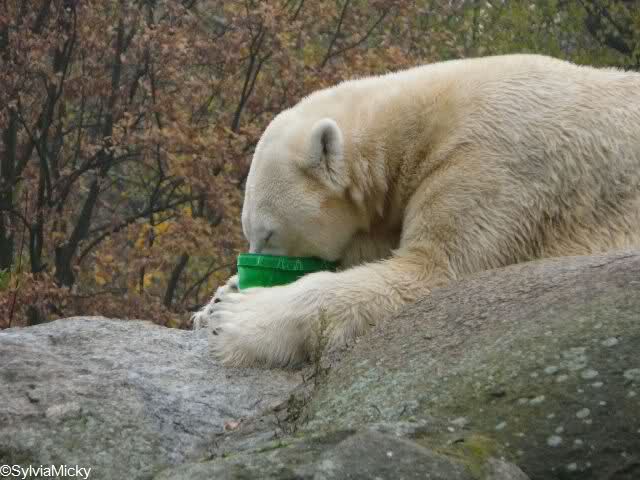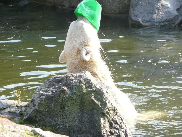 Ich habe hier mal eine Fotomontage erstellt, die zeigt, wie es aussehen könnte, wenn eine nichtspielende Eisbärin im Zoo Berlin einen Plastikeimer finden würde.