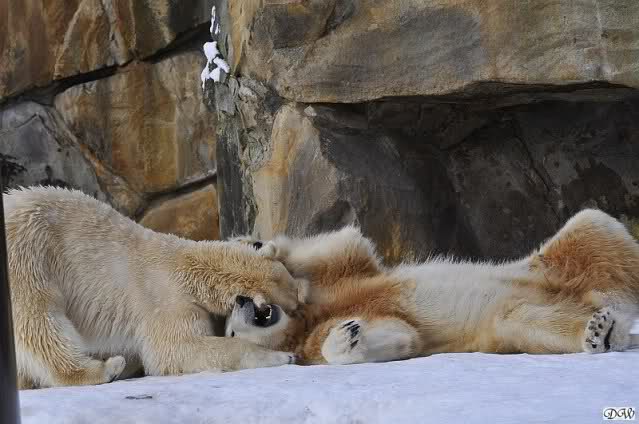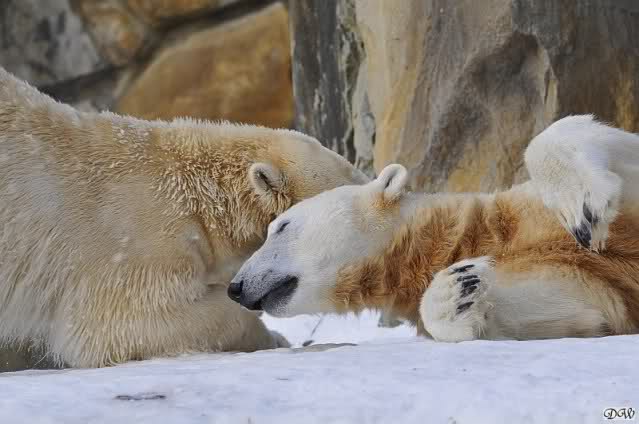 Heute war ein eher ruhiger Morgen bei Knut und Gianna. Knut schlief und Gianna lief wieder. Ab und zu ging sie gucken, ob Knut schon wach ist, dann gab es mal kurze Schmusereien. Anschließend schlief Knut weiter oder friemelte vor sich hin. So ging es den ganzen Vormittag.