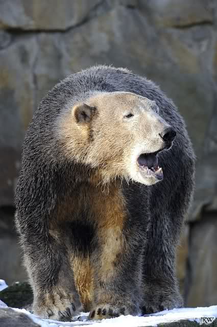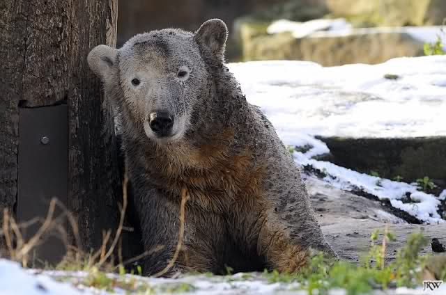 Bei den Malaienbären war heute Ladenschluss. Das heißt, der Schieber war unten und die Malaien drinnen. Eigentlich kein Wunder bei der Kälte; Malaienbären sind Tropenbären und frieren sich bei solchem Wetter allerwerteste Körperteile ab.