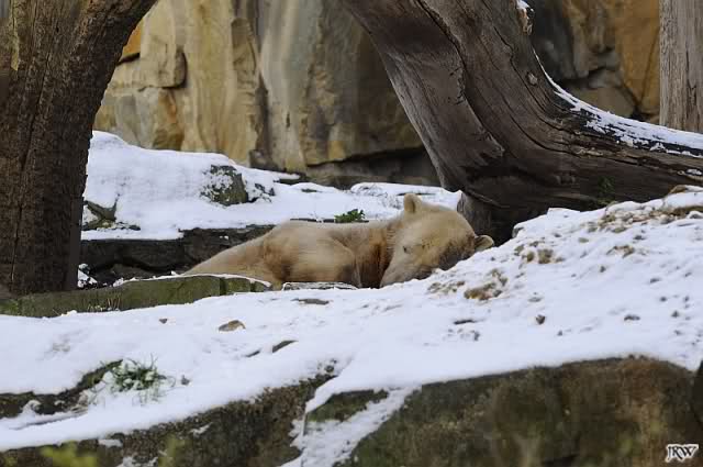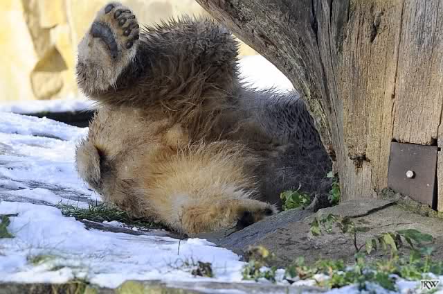 knuti,macht es sich offensichtlich,im schneebettchen so richtig gemütlich,wovon er wohl träumen mag,ist sein süßes geheimnis ,gut so.
