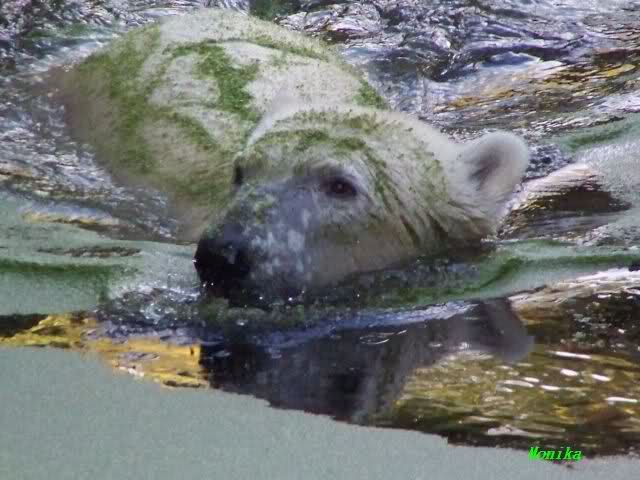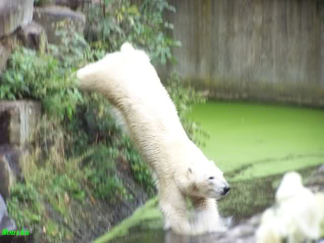 Gianna ist eine hübsche Eisbärin, mutig und schwimmt sehr gerne. Sie ist auch sehr flink. Am Nachmittag wurde das rennen weniger und sie hoppelte eigentlich mehr über die Anlage als rennen, was niedlich aussieht und die kleine Öhrchen wackeln dabei. Ich hoffe sehr, daß die beiden sich verstehen. Von Knut war nichts zu hören.