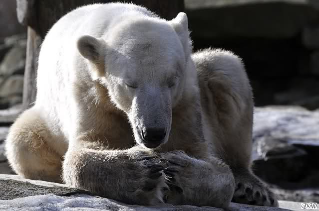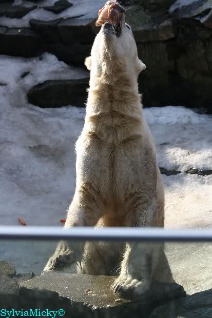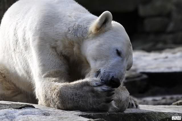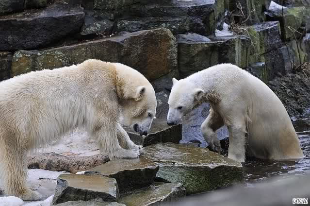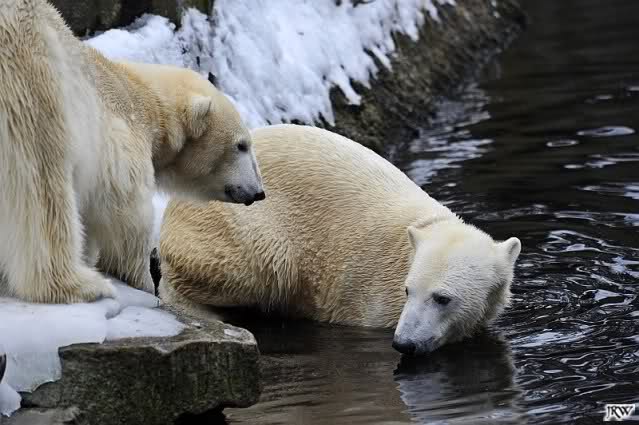 Bei Knut und Gianna war heute Nachmittag eher gedämpfte Stimmung. Knut beschäftigte sich sehr viel mit seinen Tatzen. Er leckte und leckte sie ab, manchmal nuckerte er auch. Er tat das eigentlich relativ selten in der letzten Zeit. Trotzdem ging der Blick des Öfteren in Richtung Gianna. Sie tat ihm auch den Gefallen und kam zu ihm. Nur kurz, aber sie kam. Sie lief oft über die Anlage und war dann froh wieder Jürgen-TV sehen zu können. Vielleicht hat Knut ja Spring Fever.