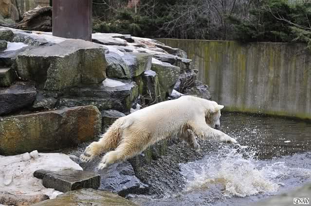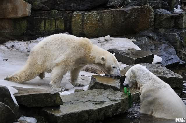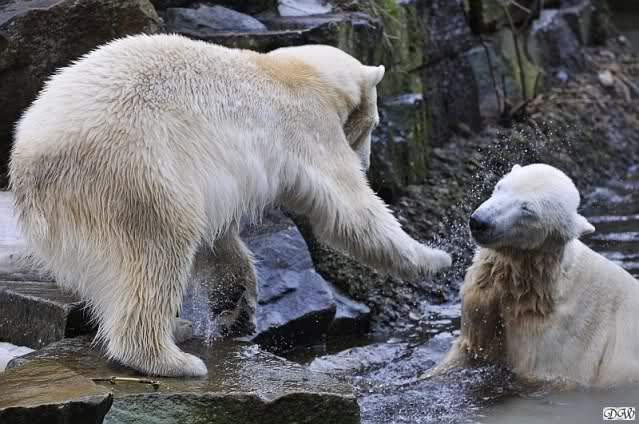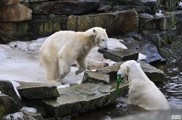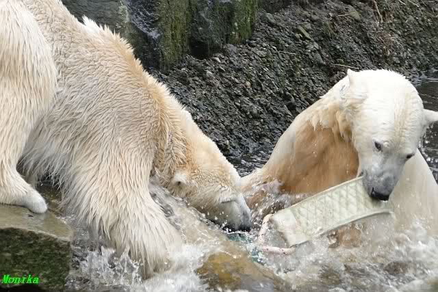 Es war ein aufregender Nachmittag bei Knut und Gianna. Wir erlebten zwei entfesselt spielende Youngster. Sie jagten die Anlage hoch und hinunter, sprangen ins Wasser von allen möglichen Ecken, spielten und tobten miteinander. Die Freude daran war Beiden deutlich anzusehen und die Besucher hatten ebenso viel Spaß sie so zu sehen, wie die Bären selbst. Er holte sich ein Spielzeug, Gianna nahm es ihm weg. Dann holte sie wiederum eins und brachte es ihm als Aufforderung zum Spiel. So ging es über lange Zeit und manchmal wusste man nicht wo man zuerst hinschauen sollte.