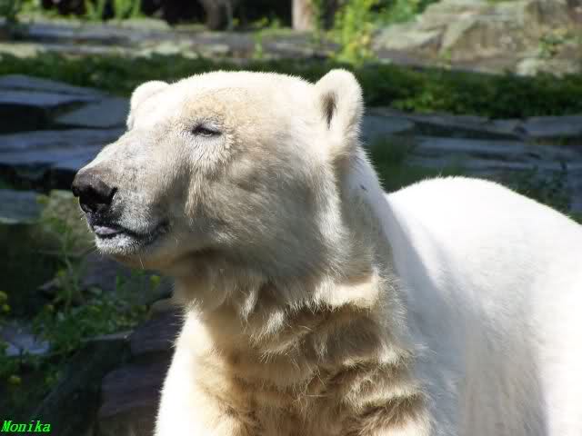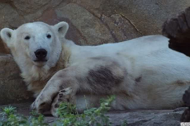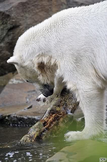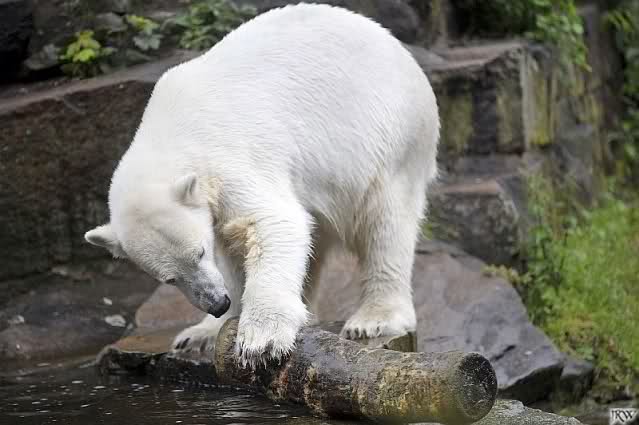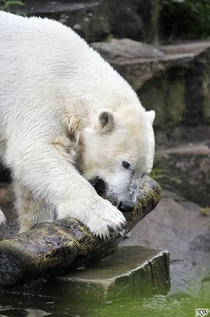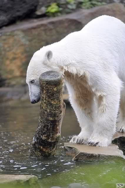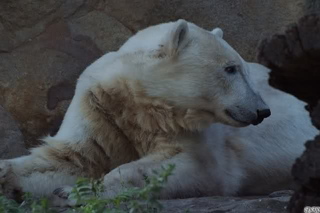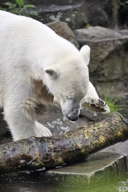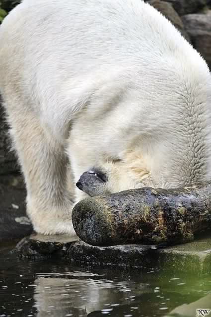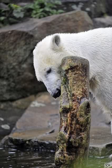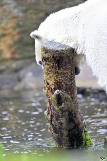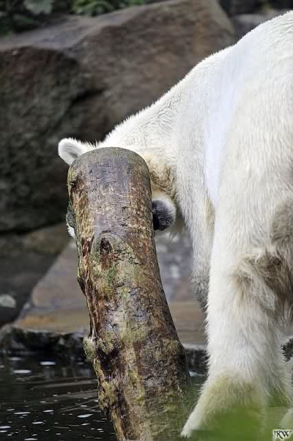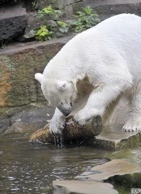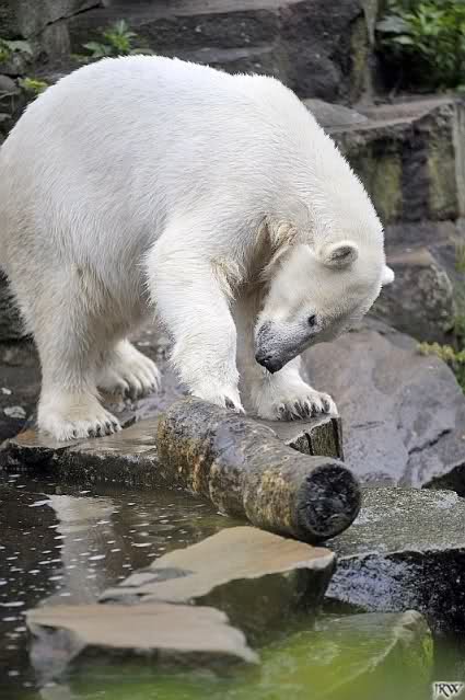 Heute war ein sonniger Tag. Wir erlebten einen weißen Knut. Morgens soll er relativ lange geschlafen haben. Dann spielte er längere Zeit im Wasser mit verschiedenen Dingen, natürlich auch wieder mit seinem geliebten Nackthuhn. Traurig war, dass er heute relativ früh anfing zu laufen. Sein Hunger schien besonders groß zu sein. Ein junger Pfleger fütterte ihn und als es nicht schnell genug ging, kam Knut zu Scheibe, schaute in den Eimer und brummte mit tiefer Stimme. Der Pfleger, der es gut gemeint hatte und Knut Zeit geben wollte, gab ihm seine Leckereien dann etwas rapider und wir sahen dann einen glücklich mampfenden Knut. Bald danach, mit gefülltem Magen entschied er sich ein Schläfchen zu machen. Besuchern passte das nicht und riefen ihn immer wieder. Jedesmal schaute er auf. Irgendetwas erregte seine Aufmerksamt im Innehof und er stellt und setzte sich an die Kante seines Felsen und schaute gebannt dorthin.