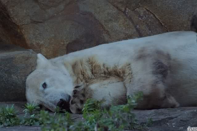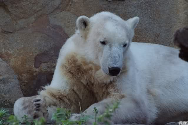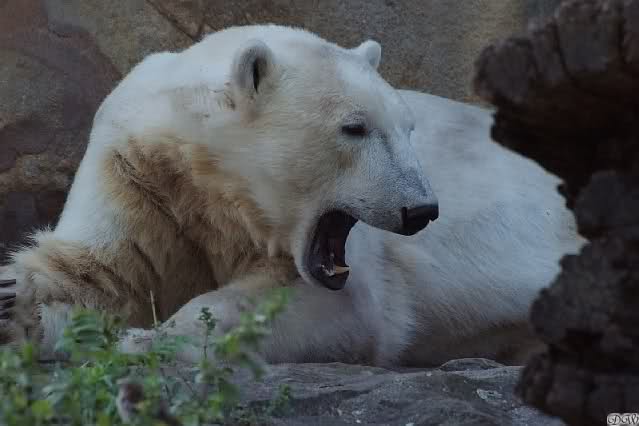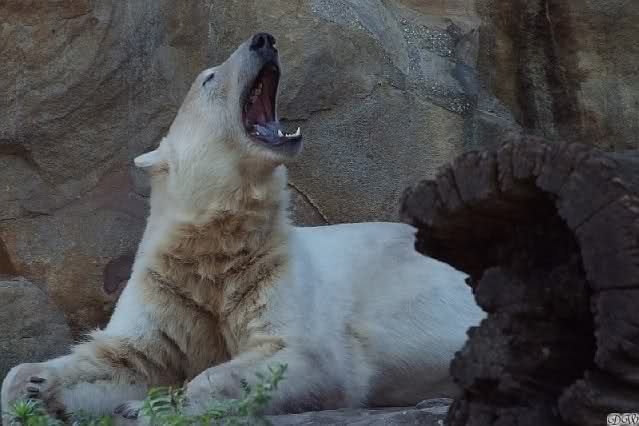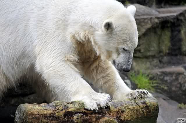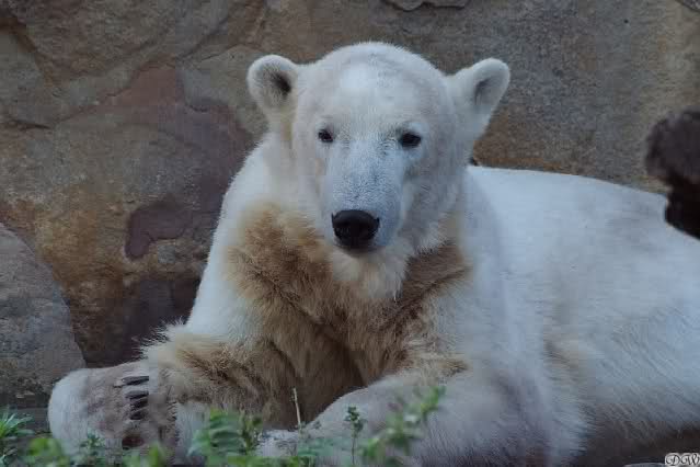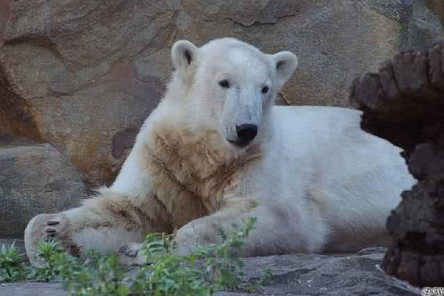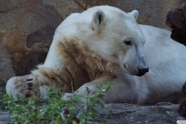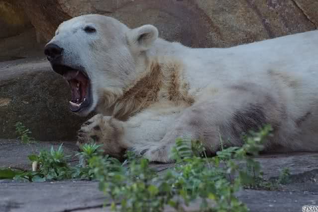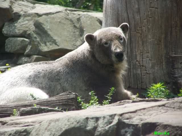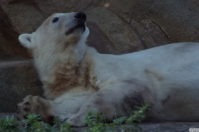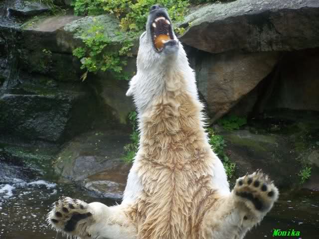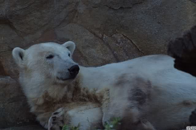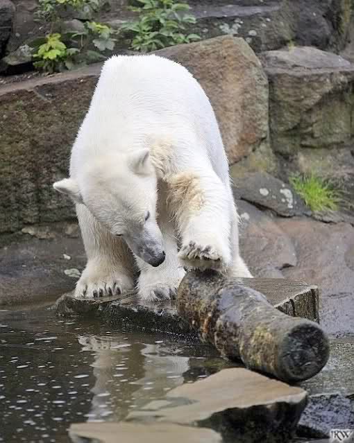 Heute war ein sonniger Tag. Wir erlebten einen weißen Knut. Morgens soll er relativ lange geschlafen haben. Dann spielte er längere Zeit im Wasser mit verschiedenen Dingen, natürlich auch wieder mit seinem geliebten Nackthuhn. Traurig war, dass er heute relativ früh anfing zu laufen. Sein Hunger schien besonders groß zu sein. Ein junger Pfleger fütterte ihn und als es nicht schnell genug ging, kam Knut zu Scheibe, schaute in den Eimer und brummte mit tiefer Stimme. Der Pfleger, der es gut gemeint hatte und Knut Zeit geben wollte, gab ihm seine Leckereien dann etwas rapider und wir sahen dann einen glücklich mampfenden Knut. Bald danach, mit gefülltem Magen entschied er sich ein Schläfchen zu machen. Besuchern passte das nicht und riefen ihn immer wieder. Jedesmal schaute er auf. Irgendetwas erregte seine Aufmerksamt im Innehof und er stellt und setzte sich an die Kante seines Felsen und schaute gebannt dorthin.
