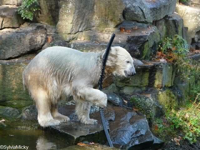ich war gegen 12.00 im Zoo und erlebte einen Eisbärjungen außer Rand und Band. Er raste über die Anlage, sprang mehrere Male vom Felsen ins Wasser und spielte mit seinen grünen "Pflanzkugeln" und dem Schlauch. Ab und zu war auch sein Surfbrett im Einsatz. Die Fütterung machte heute Frau Weckert. Sie nahm sich Zeit und blieb auch nach der Fütterung eine Weile an der Scheibe stehen. Am frühen Nachmittag wollte Knut in seine Höhle. Er drückte, schubste und sprang gegen die Tür. Leider ohne Erfolg. Er versuchte es auch an der kleinen Gittertür, die aber zu war. Danach legte er sich an den Baum mit der Metallumrandung. Ich mußte dann gehen.