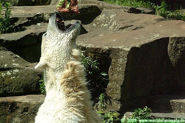 Ich ging dann zu Knut. Es waren einige Besucher da, die am Gitter standen, fotografierten und dabei halsbrecherische Verrenkungen machten. Nanu? Ganz einfach: Knut war im Wasser und spielte dort mit seinem Nackthuhn. Allerdings hatte er sich zum Spielen den Knick im Wassergraben ausgesucht, der ans Gehege der Malaienbären grenzt. Dort kämpfte er mit dem australischen Feind und zeigte uns von Zeit zu Zeit seine beeindruckenden Reißzähne.