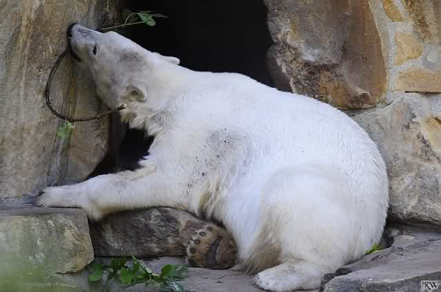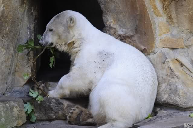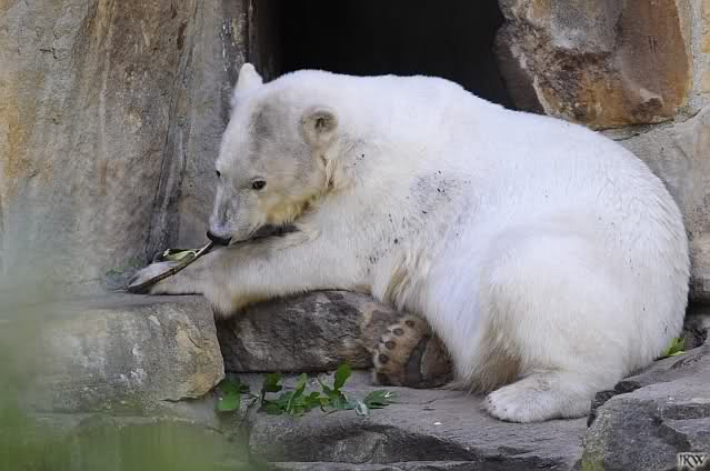 Nachdem Knut heute so gegen halb 10.00 Uhr ausgeschlafen hatte, ging er ins Wasser und spielte mit seinem Nackthuhn. Um halb 12.00 Uhr kam "Onkel Ronny" wieder mit einem neuen grünen Zweig.