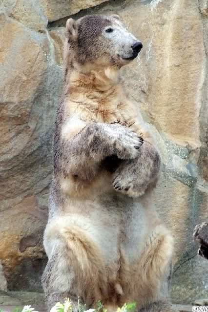 Tosca war heute überhaupt sehr selbstbewusst. Sie kam zu Lars auf die Insel und stellte sich neben ihn hin, ganz Hauptfrau und Mutter seines Sohnes. Nancy stand aufrecht auf der anderen Insel. Als Frau Weckert dann zur Glasscheibe ging, um die Brötchen zu verfüttern, standen alle drei auf ihren Hinterbeinen und guckten enttäuscht hinter ihr her. Es sah aus als wollten sie sagen: „Was denn, war das alles?“ Jedenfalls war es ein Bild für die Götter und ich dachte wehmütig an meinen vergessenen Fotoapparat.