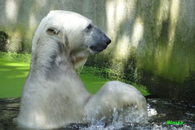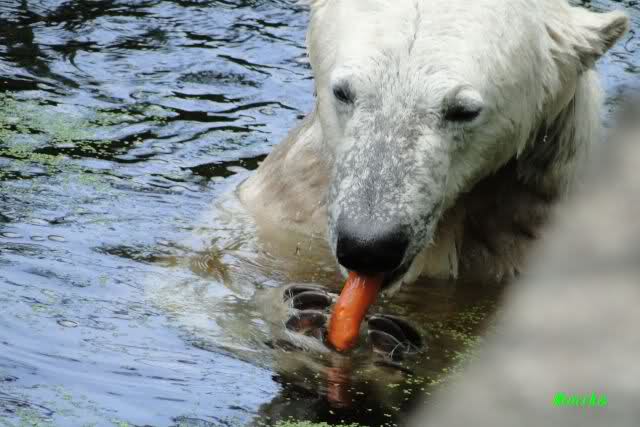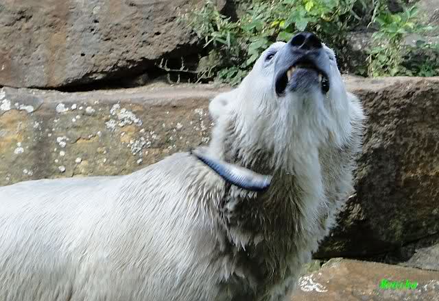 ich hoffe auch auf ganze Haufen von Sachen zur Beschäftigung auf der kleinen Anlage. Seit ich einmal Nancy unverhofft fast Auge in Auge gegenüberstand, weiss ich wie klein diese Anlage plötzlich aussieht, wenn darin eine grosse Eisbärin steht. Da wäre es mir doch lieber, dass die grossen Eisbärinnen, wenn sie eine nach der anderen zu Knut auf die kleine Anlage gelassen werden, etwas Anderes schmackhafter finden als Knut. Es würde mich sehr beruhigen, wenn ein guter Vorrat Lachse bereitliegen würde und ein paar C-Schläuche mit anhängendem Feuerwehrwagen wie in Nürnberg.