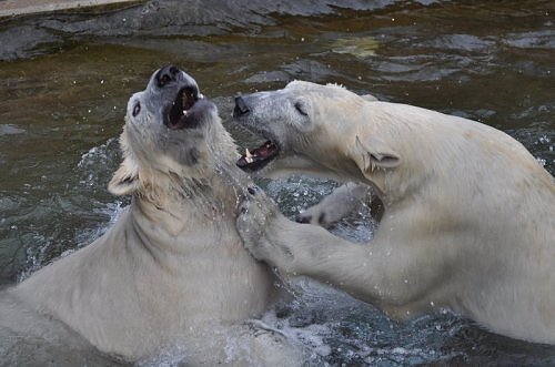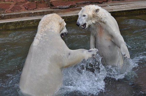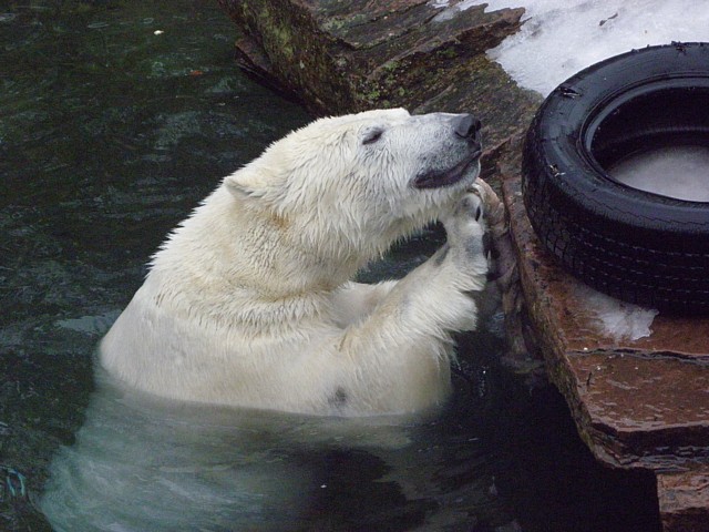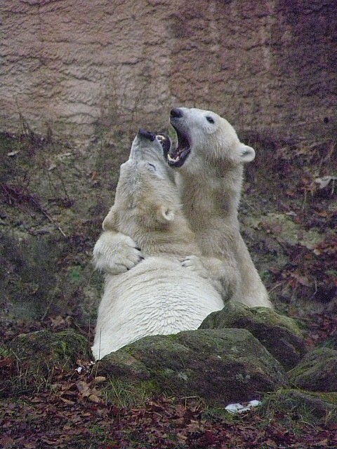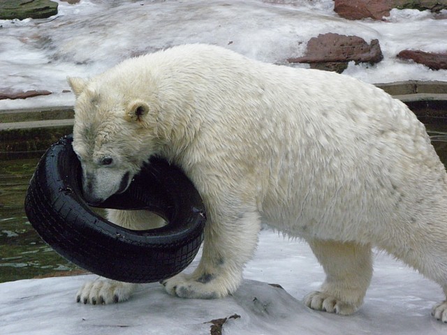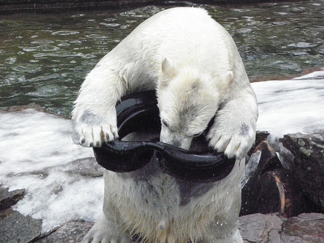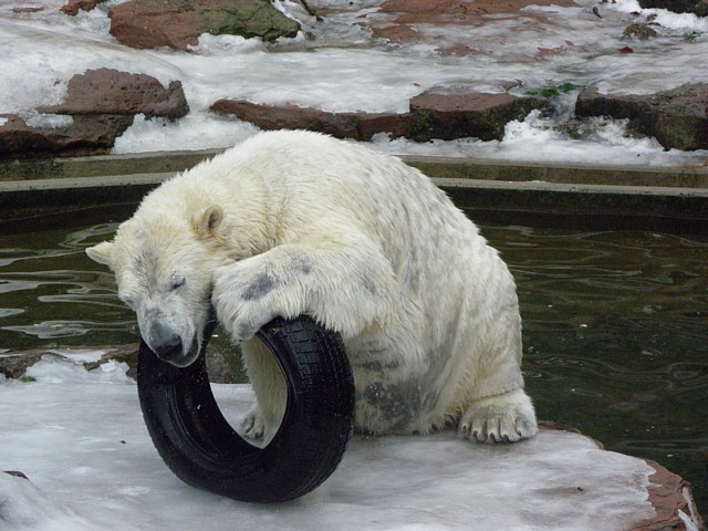 Dann bin ich zu den Bärchen. Erstmal war nicht viel los bei den beiden. Sie haben sich immer wieder in den Stall verdrückt und Flocke schien nicht wirklich Lust auf Raspi zu haben. Der hat sich dann zwischendrin mal zum Dösen hingelegt, bevor beide wieder im Stall verschwanden. Ich beschloss trotzdem, noch etwas auszuharren und das hat sich dann durchaus gelohnt Plötzlich kamen beide raus und es wurde erstmal gerauft, leider teilweise hinter den Steinen, so dass ich nicht alles mitbekommen habe. Flocke war dann öfter am Laufen und Nuckeln oder die kleine Insel abschnuppern, während Raspi mal wieder Show im Wasser gemacht hat. Reifen, Vogelreste, Flockes Kanister, egal was, Hauptsache er kann was rumschleppen und traktieren Nach fast 3 Stunden hatte ich dann leider eisige Hände und Füße, so dass ich doch lieber gegangen bin, auch wenn ich Raspi noch stundenlang hätte zuschauen können.