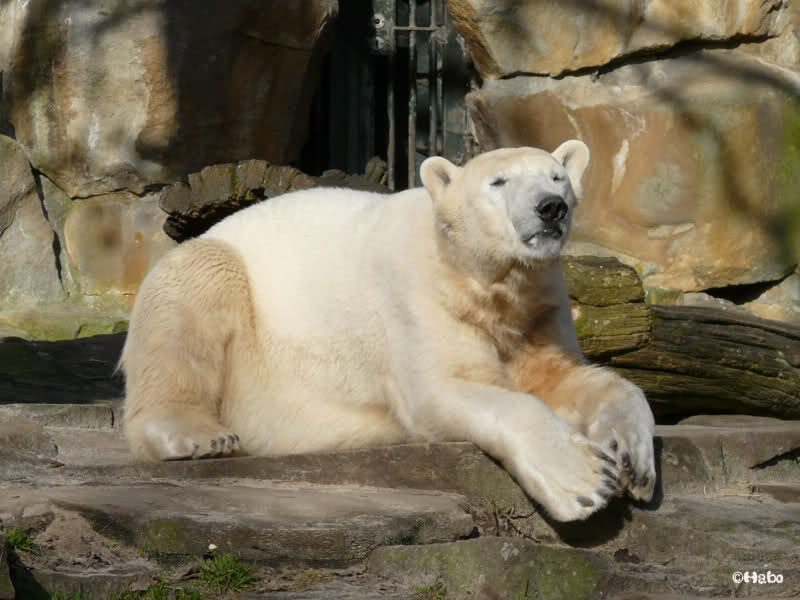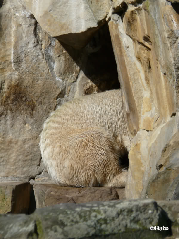 Heute Vormittag versuchte Knut in seine Höhle zu kommen. Ich weiß nicht, ob er darin was gehört hat. Danach lag er lange im Sonnenkringel und schlief.