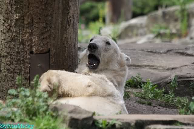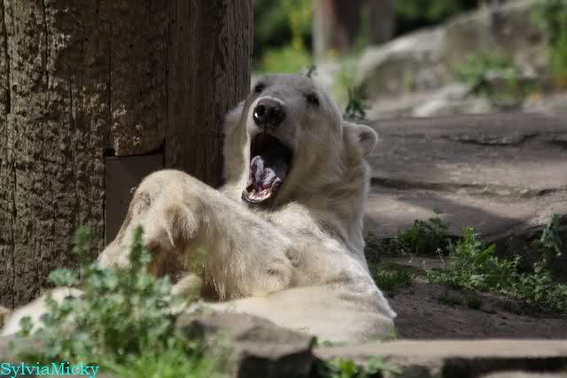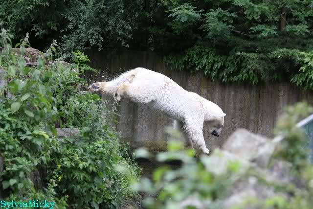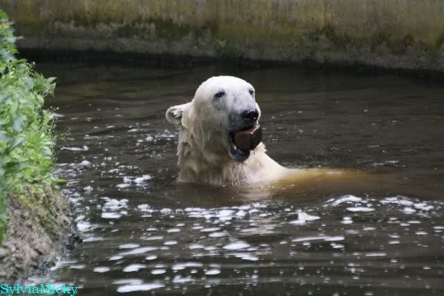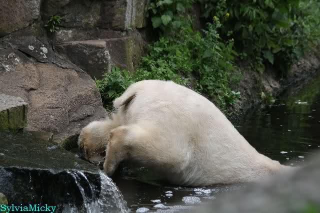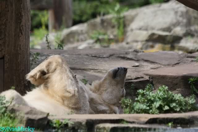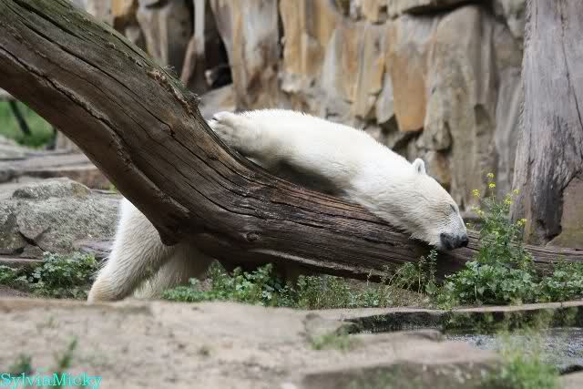 Den Vormittag kann man so beschreiben. Knut schlief und Gianna lief über die Anlage. Zum Teil sehr hektisch. Sie schaute oft zu den Kragenbären rüber. Vermessungstechniker waren nicht zu sehen. Als Knut langsam erwachte wurde erstmal gestreckt und gereckt. Langsam wie es so seine Art ist, ging er zum Wassergraben und schwamm einige Runden. Er fand dann ein Stück Holz, mit dem er sich lange und ausdauernd beschäftigte.