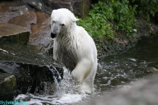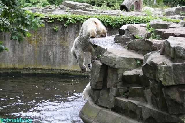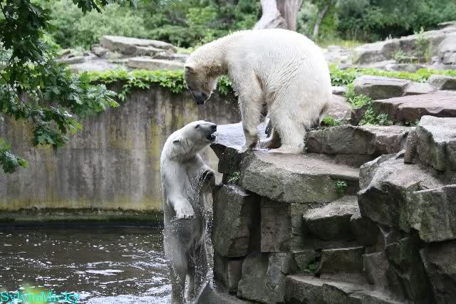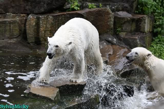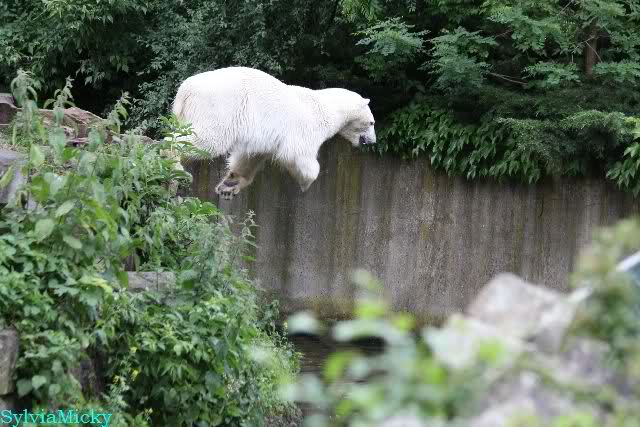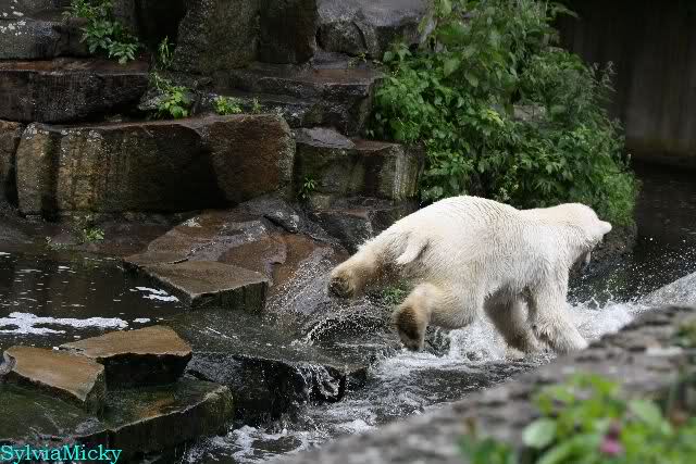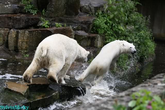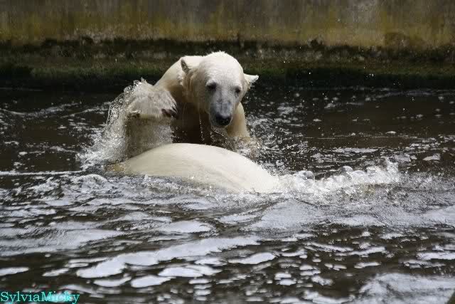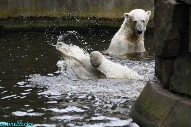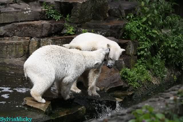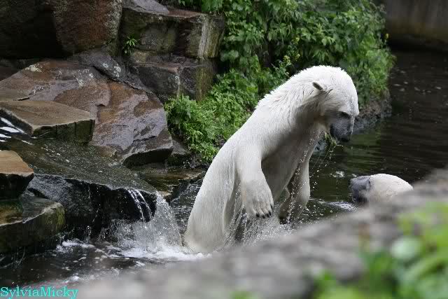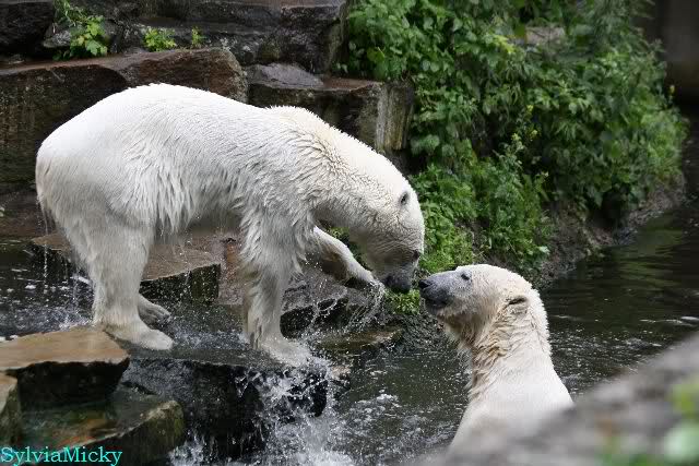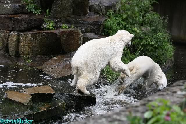 Welch Kräfte messen für Knut und Gianna. Schließlich hat ja Knut ein 280 Kilo (von mir geschätzt) Gegenüber, der er sich sehr gut erwehren kann. Welche Kraft, Ausdauer und Kondition er beim toben an den Tag legt ist schon beeindruckend. Irgendwann war es Gianna zu viel und sie lief auf der rechten Seite des Felsens auf die Anlage.
