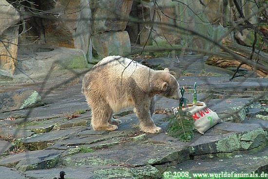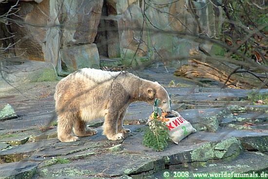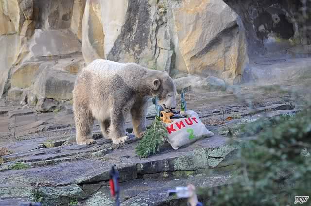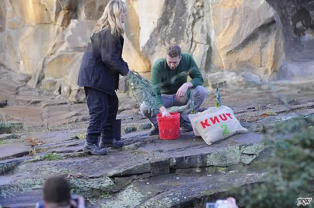 Knut musste für kurze Zeit seine Anlage verlassen, da Frau Weckert und Herr Röbke die Geschenke für Knut auf die Anlage brachten: Eine Eistorte mit viel Leckereien, Tannenzweige, einen Jutesack mit Quietscheball und einen Lachs. Zu diesem Zeitpunkt hatten sich schon einige hundert Knutfreunde aus aller Welt an der Anlage eingefunden.