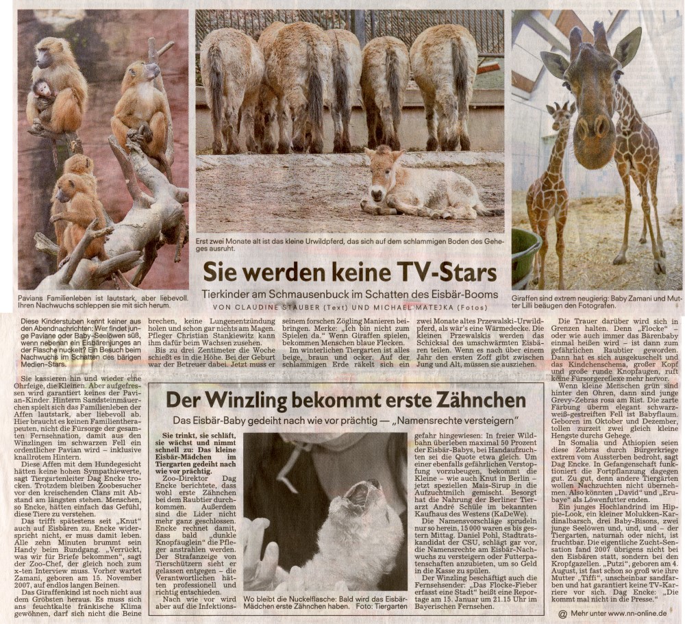 Es ist wohl absurd, den Tiergartenmitarbeitern in Nürnberg zu unterstellen, dass sie nicht das Wohl des Eisbärennachwuchses im Auge hatten und die Jungbären absichtlich oder fahrlässig sterben ließen und im anderen Fall eine Störung mit Latten und Leisten oder sonstwas herbeiführten. Vielmehr sollte mal überlegt werden, ob nicht die unsägliche Silvesterknallerei Ursache gewesen sein könnte und künftig im Umfeld verhindert wird. Wer Haustiere hat, weiß wie lange solche Traumata nachwirken können. Der Knall bedeutet für Tiere instinktiv Gefahr.