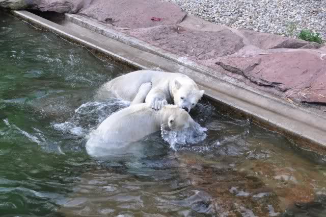 Einfach herrlich anzusehen: Flocke und Rasputin balgen sich im Wasser. Happy polar bear kids. Danke Uli für die weitere Bilderserie von den beiden glücklichen Eisbären Kids.