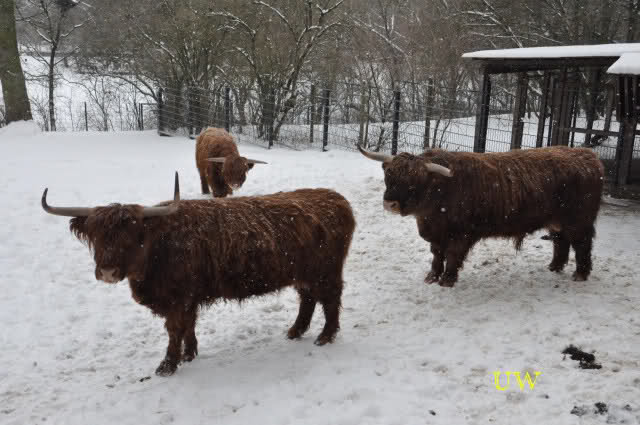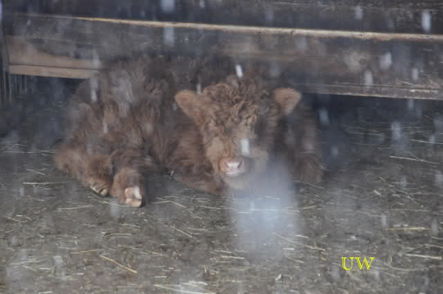 Zuerst ein Besuch bei den schottischen Hochlandrindern, das Kleine blieb lieber im Stall, den Großen machte das Wetter nichts aus