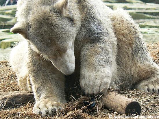 Knut geht sehr vorsichtig mit einem kleinen schwarzen Plastikteil um, das ihm eine Krähe wegnehmen wollte. Er spielte einige Zeit damit herum, verschluckte es aber Gott sei Dank nicht.