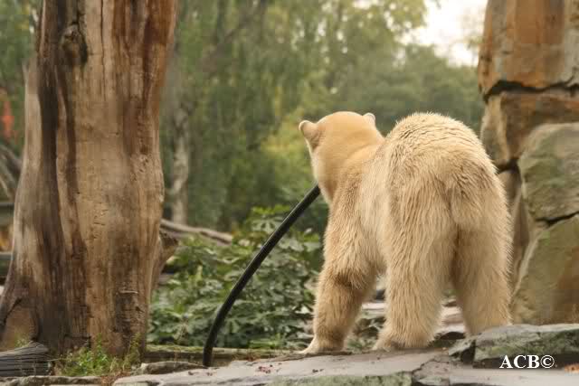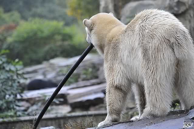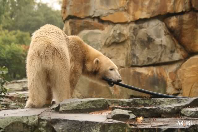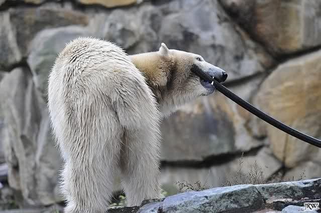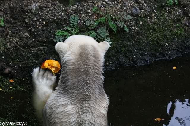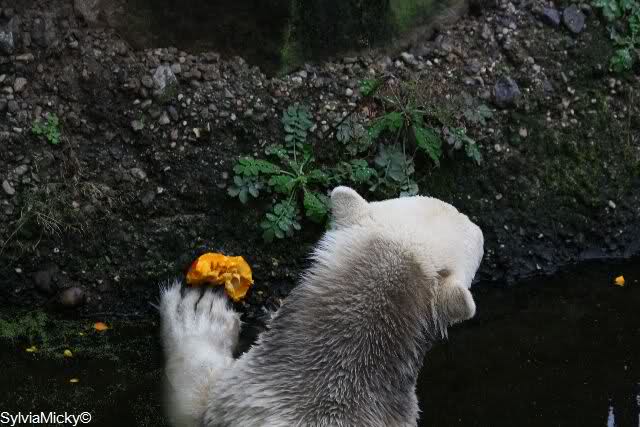Das wir einen intelligenten Bären haben wußten wir ja aber heute Mittag hat sich Knut nochmal übertrumpft. Da Gianna ihm immer den Kürbis weggefressen hat, was macht Knut? Er bleibt im Wassergraben, drückt den Kürbis an den Felsen unterhalb des Sandhaufens und frißt ihn. Gianna sah von oben herab und war nese.