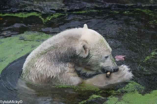Gefüttert wurde Knut wieder von dem jungen Pfleger. Er läßt sich viel Zeit und es gab reichlich.