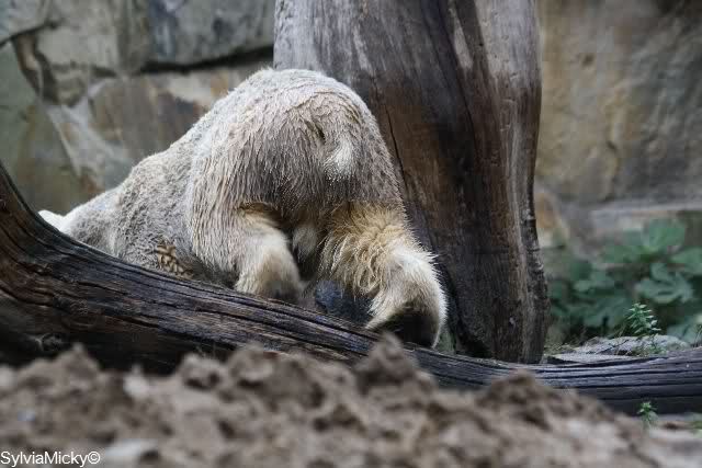 Gegen Mittag lag Gianna auf der Anlage und döste. Knut schwamm im Wassergraben. Er lief dann vor der Fütterung hin und her und ging ganz dicht an sie ran. Gianna erschrak und erhob sich halbherzig.