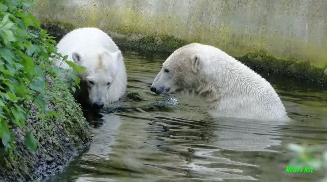 Nach der Fütterung spielten die beiden eine kurze Zeit im Wasser. Knut fand das Huhn. Er hoffte, daß sie ins Wasser kommen sollte aber Gianna wollte aber nicht.