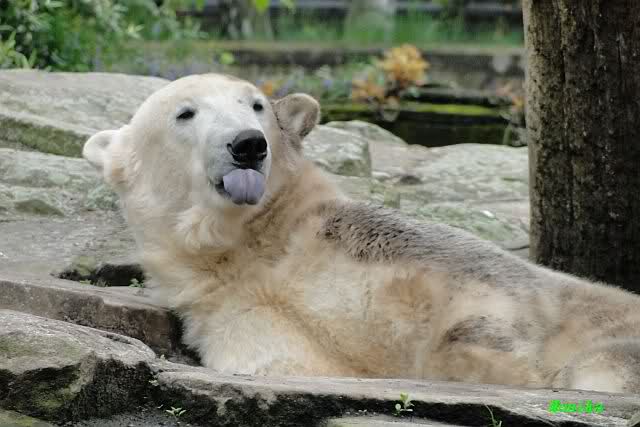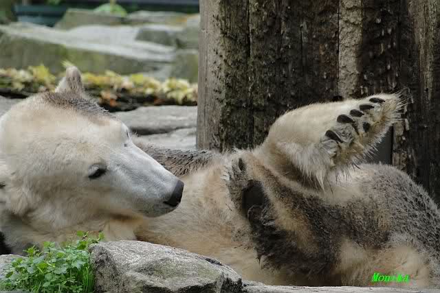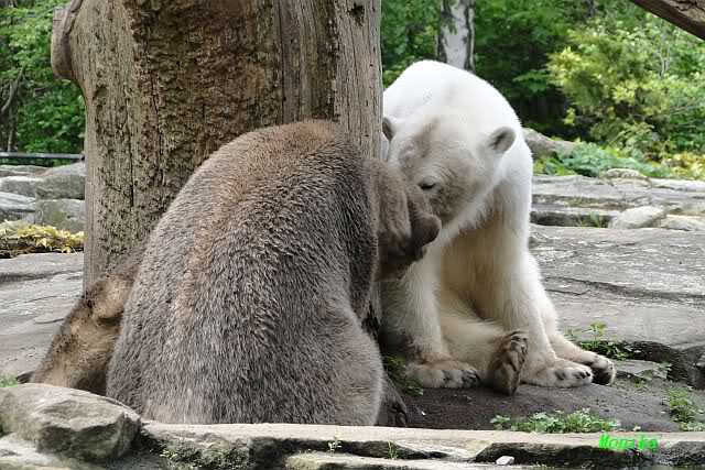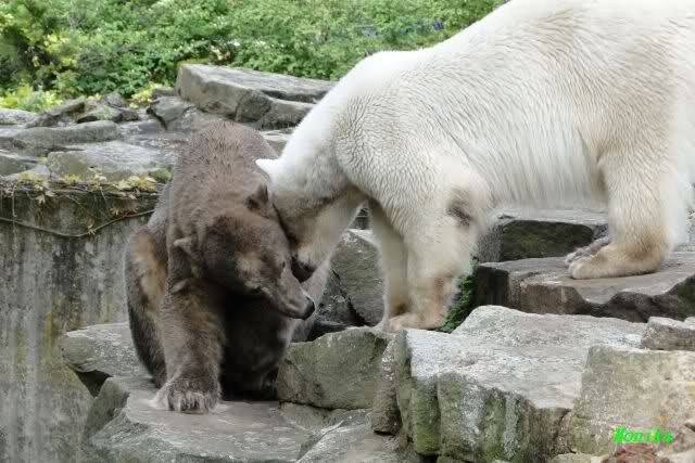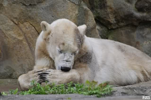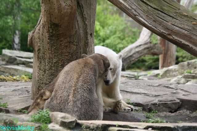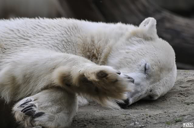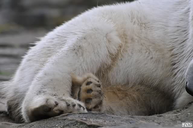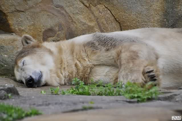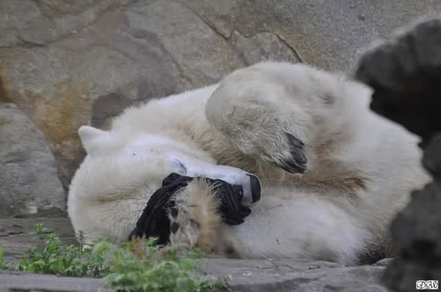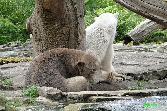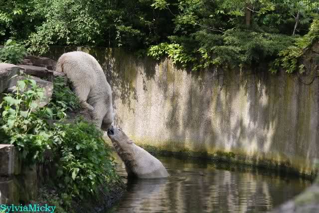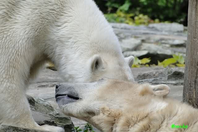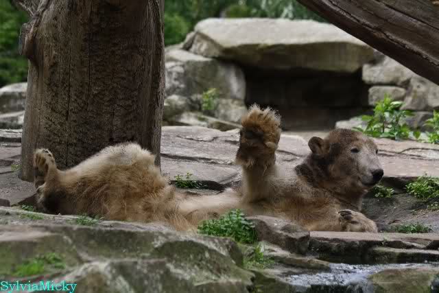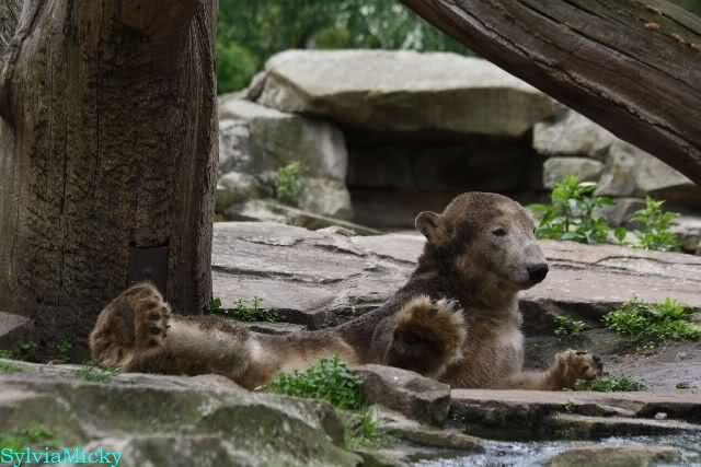 Heute Vormittag schlief Knut und Gianna lief. Sie ging mehrmals sehr vorsichtig zu ihm hin aber Knut zeigte Tapirlippe oder zog sich zurück. Merkwürdig dies Verhalten in letzter Zeit. Nur im Wasser zeigt er keine Ängstlichkeit.