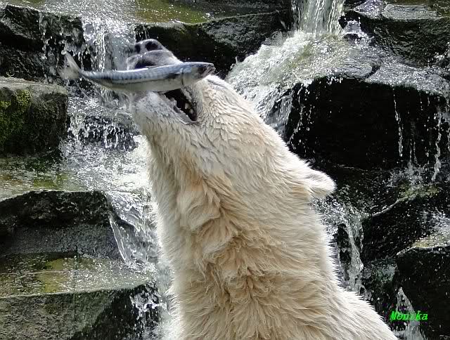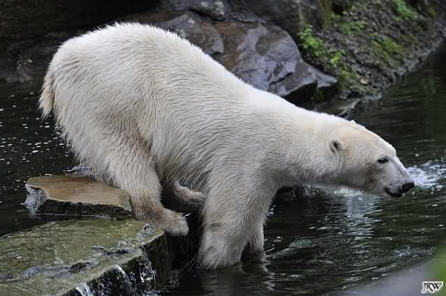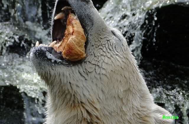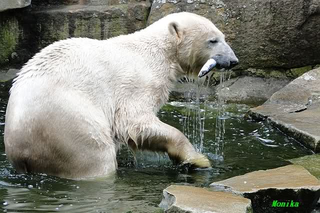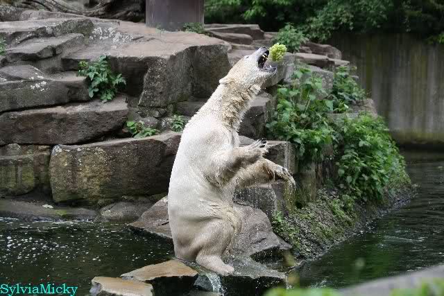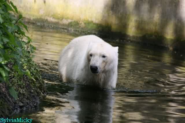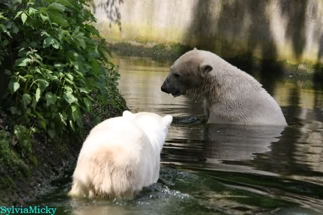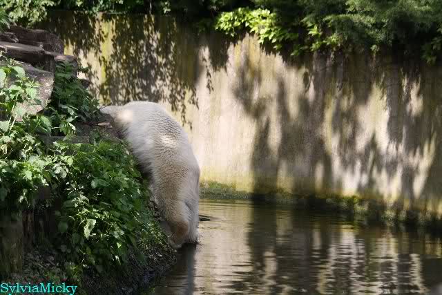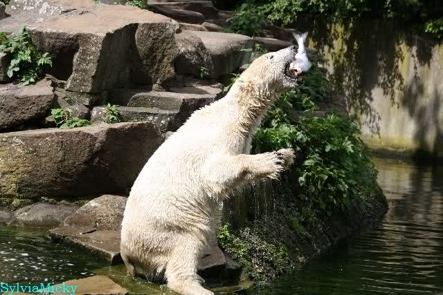 Als eine Kindergruppe wieder Brötchen und Nüsse bei den großen Eisbären verteilte, weigerte sich Nancy standhaft ins Wasser zu gehen. Tosca und Katjuscha ließen es sich hingegen schmecken.
