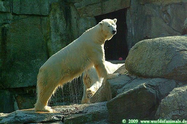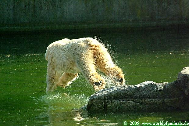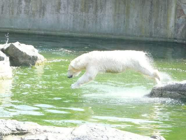 Hier nun Fotos vom heutigen Nachmittag. Die Sprungfotos entstanden zu einer ganz anderen Zeit als die von SylviaMicky. Das zeigt auch, wie lebhaft es heute auf der Eisbärenanlage zuging.