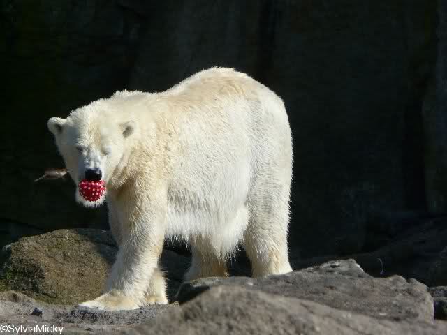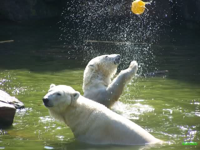 "Eisbären spielen nicht", diese Behauptung, die man vereinzelt liest und hört, wirkte heute wie ein billiger Witz. Die Bären bewiesen genau das Gegenteil . Es ist so einfach, den Zootieren ein wenig Abwechslung zu bieten.