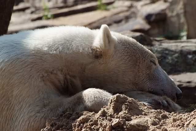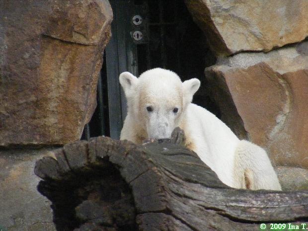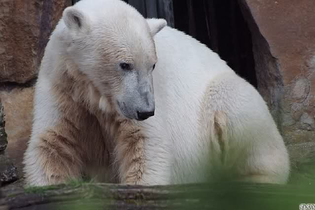 Gestern kam ich kurz nach halb zehn im Zoo an und ging sofort zu Knut. Zur Feier des Tages schlief er ausnahmsweise mal nicht. Knut hockte halb in seiner Höhle. Weil die Höhle zu war, guckte nur noch sein verlängerter Rücken hinten heraus.