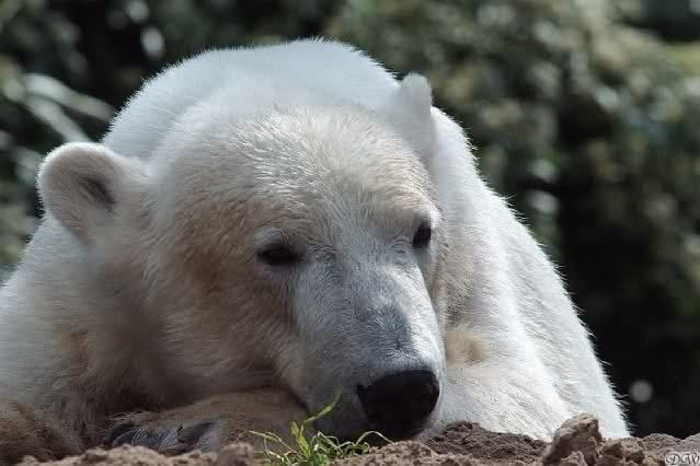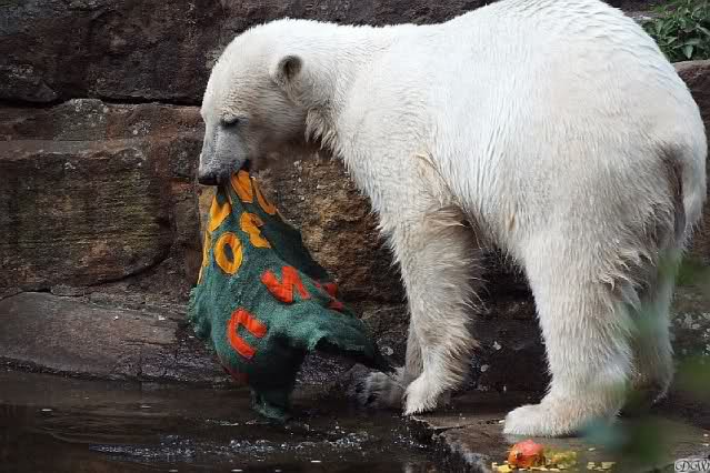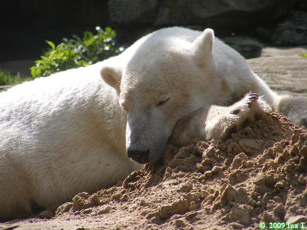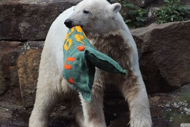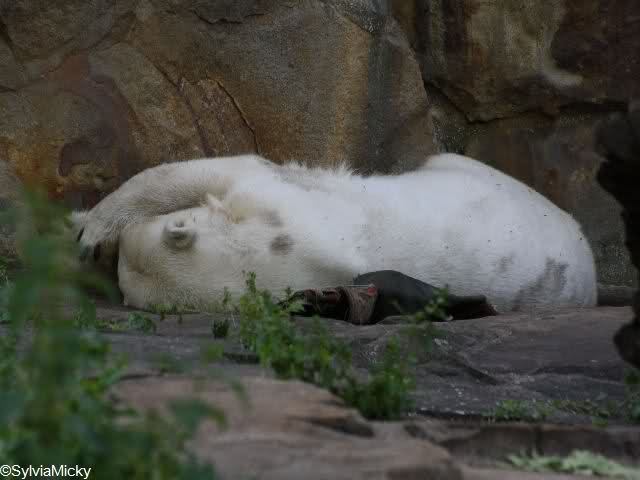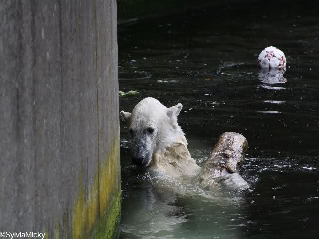 auch von mir noch ein paar Fotos und ein Zoobericht von gestern. Als wir gestern im Zoo ankamen, wussten wir gar nicht, wo wir langgehen sollen. Überall wird gebuddelt, bei den Elefanten und den Affen ist ja Hochbetrieb. Zu meinem Bedauern kamen wir zu spät, um die Fütterung der grossen Eisbären mitzubekommen. Frau Weckert war gerade fertiggeworden. So gingen wir zu Knut. Es war eine Odyssee, da man einen grossn Bogen gehen musste. Unterwegs traf ich einige Knutfans. Als ich bei Knut ankam, schlief der gerade den Schlaf der Gerechten und drehte uns den Allerwertesten zu. So beschlosen wir, ihm erst eine Weile zuzusehen und dann gingen wir zu den Brillenpinguinen und den Seelöwen. Auch da hatten wir Pech, die Fütterung der Seelöwen war auch gerade zu Ende gegangen. Volker lag gerade auf einem Stein und döste. Die anderen waren im Wasser. Weiter oben auf einem anderen Stein lagen auch zwei Seelöwen. So gingen wir erst einmal ins Zoorestaurant und wärmten uns auf. Ausserdem hatten wir Hunger. So aßen und tranken wir erst einmal etwas. Das passte gerade, da es anfing zu regnen. Wie mir Doris Webb später sagte, hatte Knuti aber wunderschön gespielt. Wir gingen zurück zu Knut, der aber noch döste und uns den Allerwertesten zudrehte. Dann erwachte er und gähnte laut. Als erstes wurde das Nackthuhn ausgepackt und damit gespielt. Er schlug es sich regelrecht um die Ohren, es krachte richtig. Dann begann Knut zu laufen, es ging auf die Fütterung zu. Unser Bärchen geduldete sich eine ganze Weile. Frau Weckert war noch nicht in Sichtweite, aber in "´Riechweite". Dann kam Frau Weckert mit seinem Futtereimer. In einer Tüte hatte sie einen riesigen Lachs. Wir hatten auch eine Tüte für Knut, die grosse Leibspeise unseres Gourmets sind ja die Croissants. Ich gab Frau Weckert die Tüte für Knut. Knut warte schon geduldig auf die Dinge, die da kamen. Heute, an seinem 2 1/2 Geburtstag bekam er ein leckeres Festmahl. Dieses bestand aus Salat, Weintrauben, Möhren, Kartoffel, zwei Fleischstücken, einem grossen Lachs, Apfel, zwei Birnen und fünf Croissants. Dann bekam er von einer anderen Knutianerin ein Kissen mit der Aufschrfft "Knut 30 Monate". Dieses war mit Hundefutter und Spielzeug gefüllt. Leider bekam ich nicht alles mit, da wir noch auf einen Kaffee in die Waldschänke gingen. Angeblich hatte Knut in der Zwischenzeit schon den Inhalt des Kissens aufgefressen.