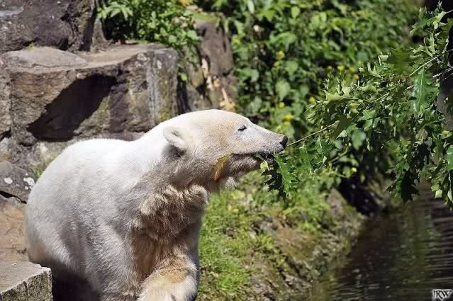 Nach der Fütterung spielte Knut heute lange im Wasser mit dem Baumstamm und einem Zweig. Als Knut auf der Rückseite der Anlage mit dem Nackthuhn spielte, fiel Jürgen dem Lippenbär glatt sein Brötchen aus dem Maul. Er war völlig verwundert was Knut da alles anstellte.