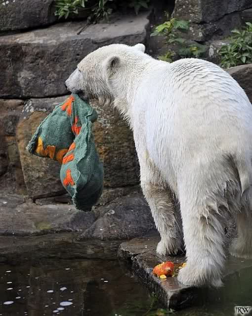 Knut bekam gestern wieder sehr viel Futter. Es hörte fast gar nicht mehr auf. Zu dem Futter vom Zoo gab es einige Croissants, ein Rosinenbrot, einen Lachs und als krönenden Abschluss einen kleinen Kürbis. Außerdem bekam er noch einen schönen, neuen Jutesack, dieses Mal in grün und wieder mit seinem Namen darauf. Knut nahm ihn gleich in Besitz und schleppte ihn nach oben auf seine Anlage.