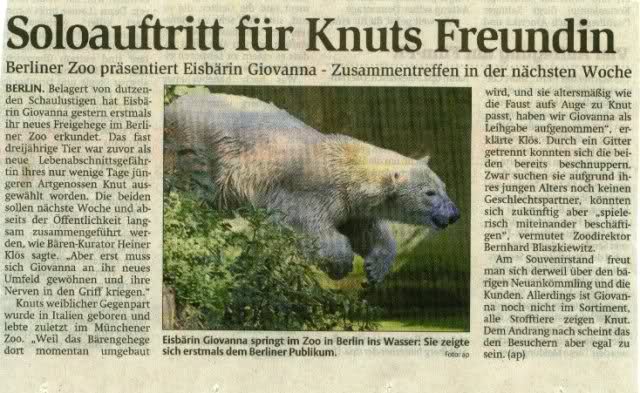 Ich hatte gestern kurz Zeit in den Zoo zu gehen, ich wollte Gianna sehen und noch einen Blumenstrauß zum Gedenken an Herrn Dörfein hinlegen. Wie Yeo schon beschrieb, mußte man den Reportern ausweichen, die nach der Meinung fragen wollten, wobei man als "Frau mittleren Alters" natürlich in das Klischee passt. Ich kann die hier geschilderten Eindrücke nur bestätigen, wie blitzschnell und aufgeregt Gianna über die Anlage raste. Ich habe sie gleich in mein Herz geschlossen, wobei natürlich Knut die Nr. 1 bleibt, das ist eben Knut! Interessant war schon, dass ahnungslose Touristen Gianna für Knut hielten, ich möchte nicht wissen wie viele Touristen mit den Bildern von Gianna nach Hause gehen und denken sie haben Knut gesehen und fotografiert. Ein nettes Ehepaar habe ich aufgeklärt, sie hatten sich schon gewundert, wieso Knut so aufgeregt ist. Beruhigend sind die heutigen Mitteilungen, dass Gianna heute schon ruhiger auf der Anlage zu Gange ist. Wie viele neue Eindrücke muß sie in der kurzen Zeit verarbeiten.