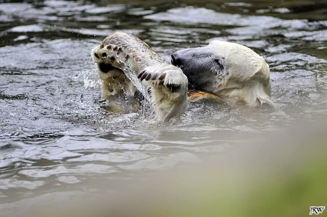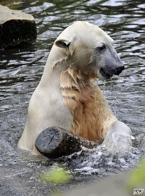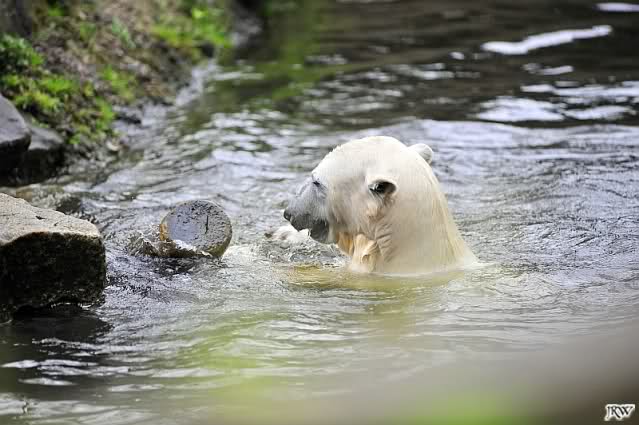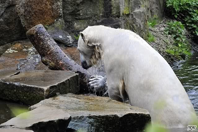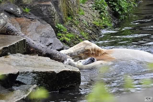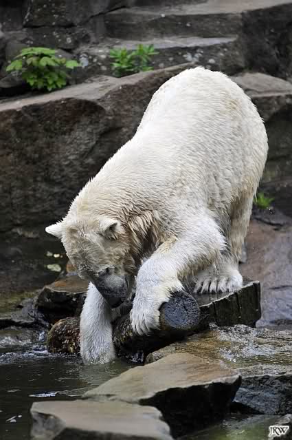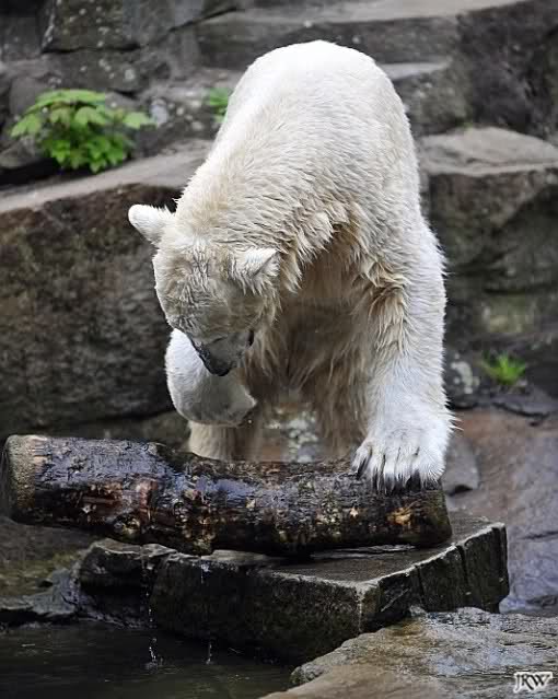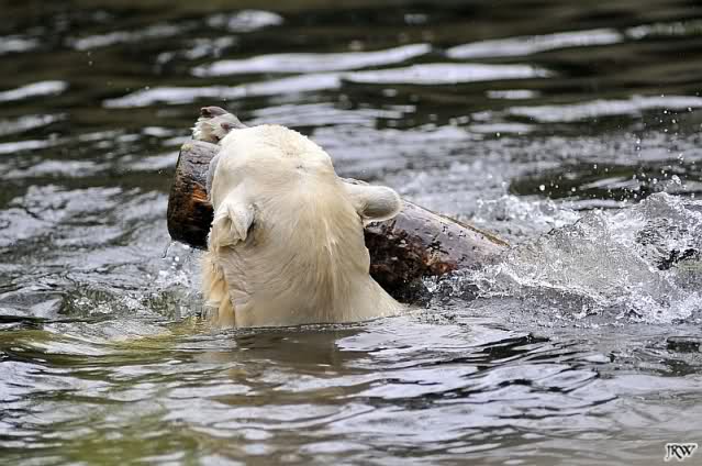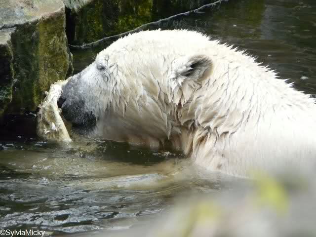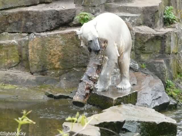 Knut spielte heute mit einem großem Baumstamm, den er aus dem Wasser zog, in dem Teich hin und herrollte und wieder ins Wasser warf. Beeindruckend seine Kraft.