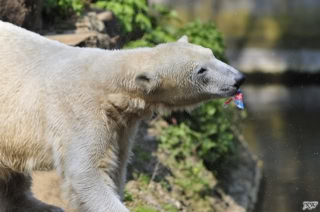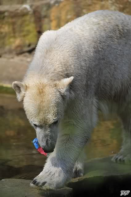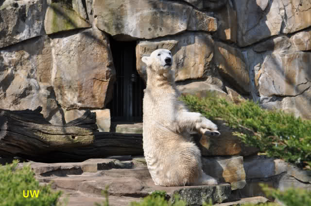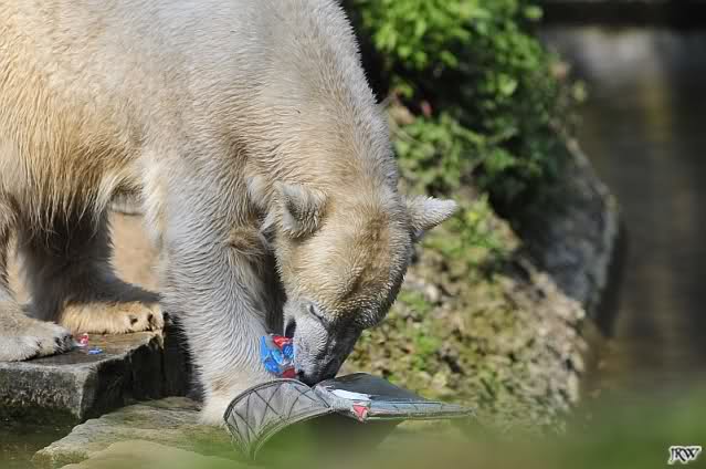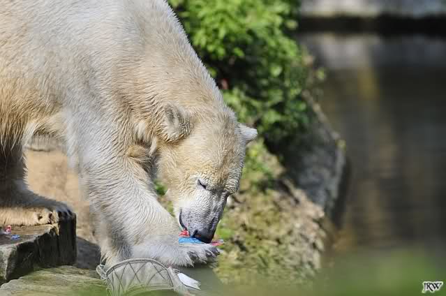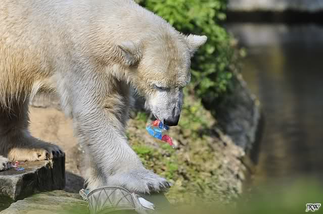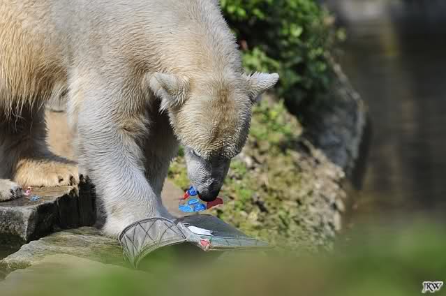 Knut geht es sehr gut. Er hat Spielzeug und er bekommt öfters in der Woche Lachs, Weintrauben, Croissants oder Rosinenbrot von den Besuchern. Deshalb kann ich Leute überhaupt nicht verstehen, die immer wieder behaupten, er soll weg aus dem Zoo. Ich bin oft genug im Zoo und erlebe einen glücklichen, zufriedenen kleinen Eisbär.