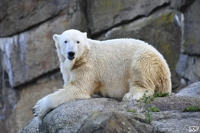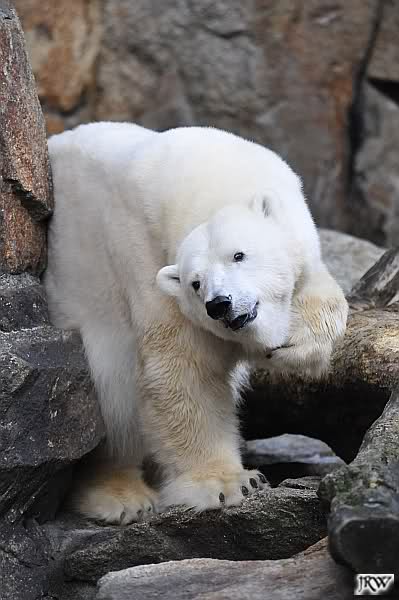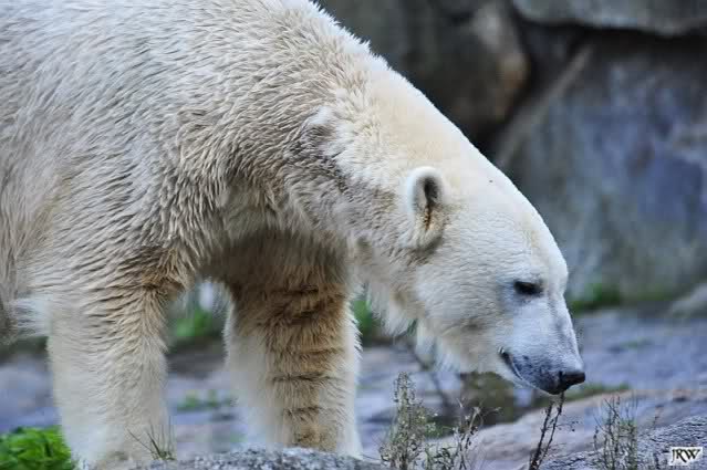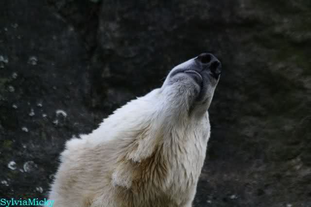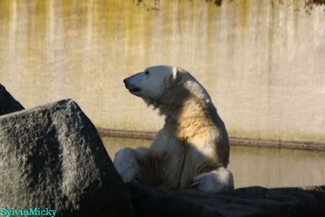 Warum Knut heute Nachmittag diese Phase hatte ? Das weiß wohl nur er allein. Jedenfalls thronte er, nachdem die drei Eisbärinnen in ihren Höhlen waren, auf dem höchsten Platz der Anlage und schaute zufrieden ins Rund.