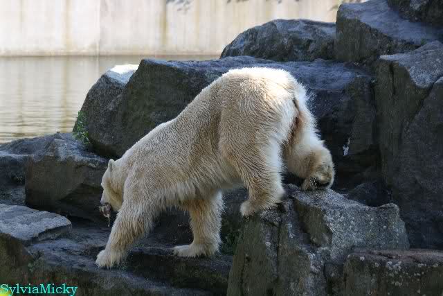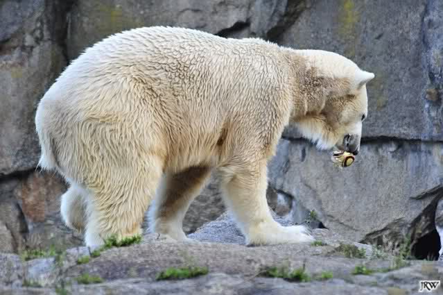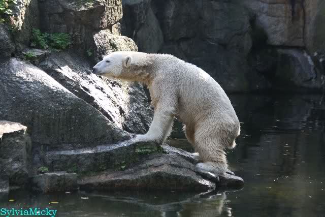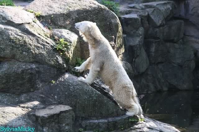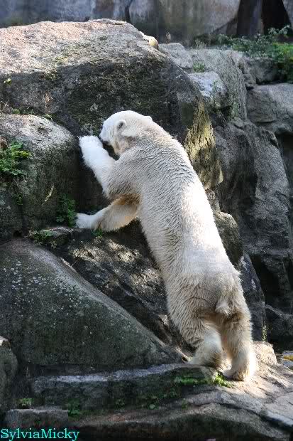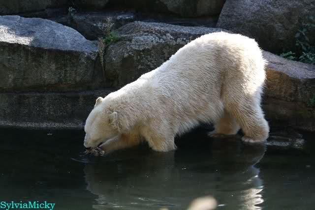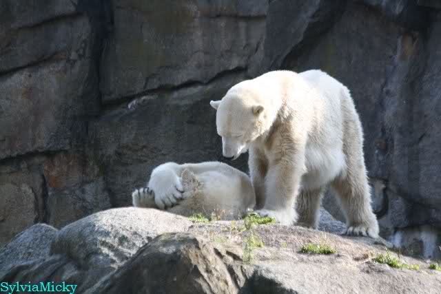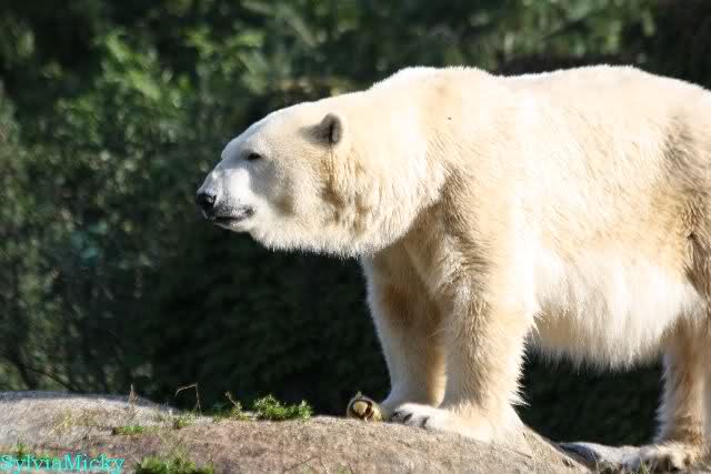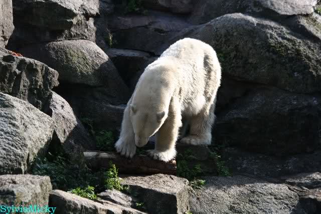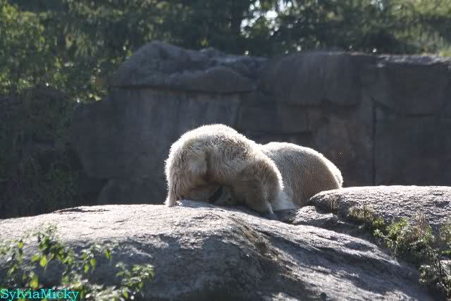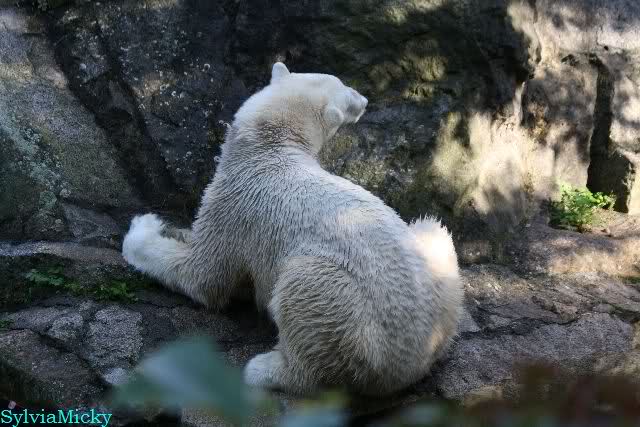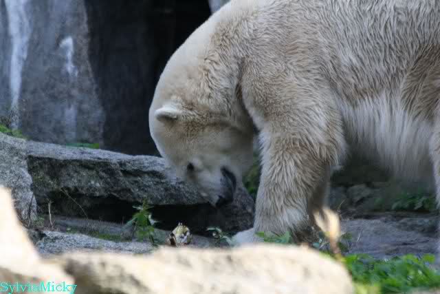 Wäre sie noch ein wenig länger geblieben, hätte sie die Verwandlung sehen können, die in Knut vorging sobald das Zicken-Trio auf der kleinen Anlage verschwunden war. Erst besuchte er Kati’s Höhle und sicherte sich sofort den höchsten Felsen. Dort sah er den lädierten Ball und holte ihn sich. Er spielte einige Zeit damit bis er ihm hinunter fiel. Auf jeden Fall sahen wir dann wieder einen relativ zufriedenen „kleinen“ Knut.