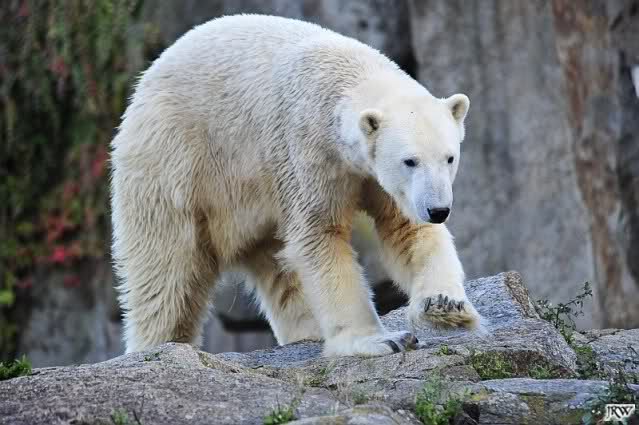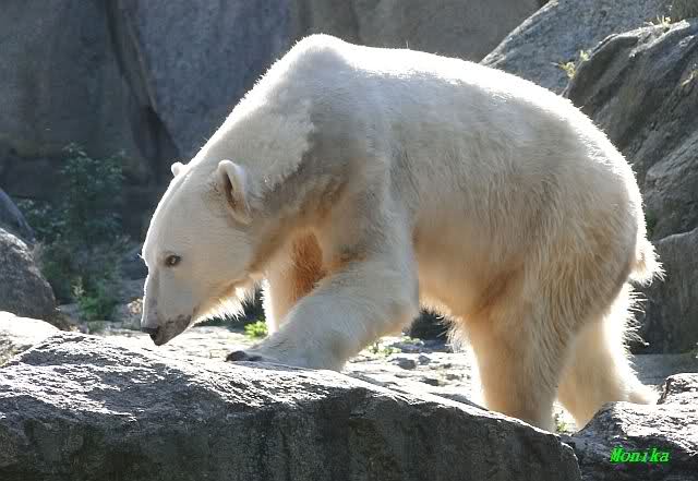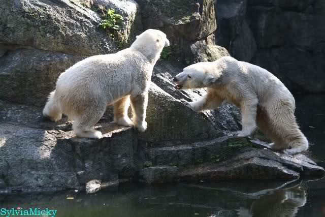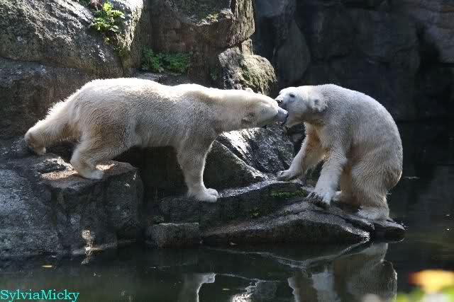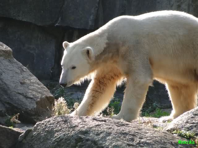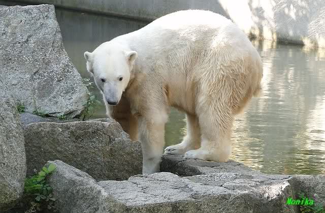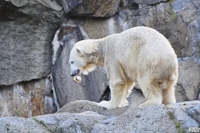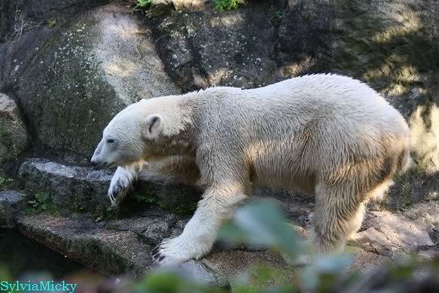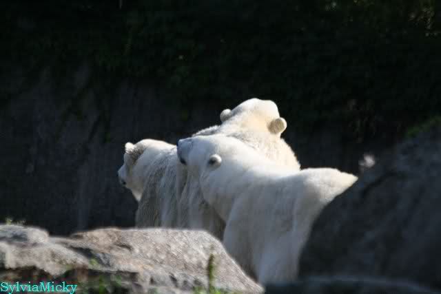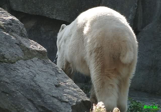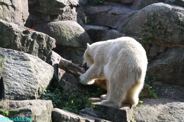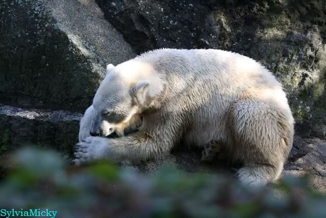 Wäre sie noch ein wenig länger geblieben, hätte sie die Verwandlung sehen können, die in Knut vorging sobald das Zicken-Trio auf der kleinen Anlage verschwunden war. Erst besuchte er Kati’s Höhle und sicherte sich sofort den höchsten Felsen. Dort sah er den lädierten Ball und holte ihn sich. Er spielte einige Zeit damit bis er ihm hinunter fiel. Auf jeden Fall sahen wir dann wieder einen relativ zufriedenen „kleinen“ Knut.
