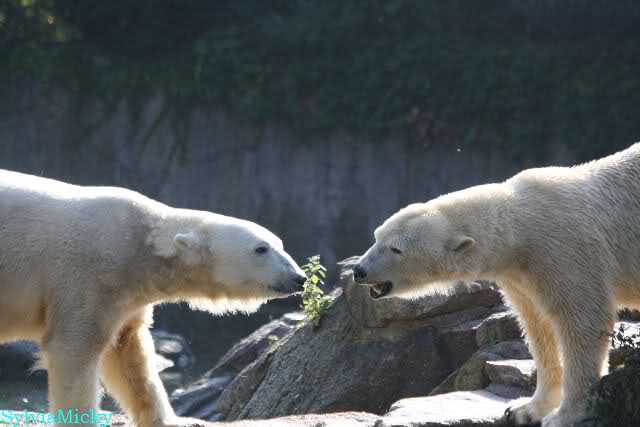 Knut sah sie und kletterte nach oben. Das sah Kati und kam angepest. Knut kletterte trotzdem nach oben und stellte sich ihr mit lautem Brummen und weit aufgerissenen Maul entgegen. Kati zog sich schließlich zurück.