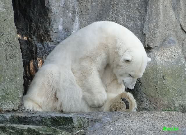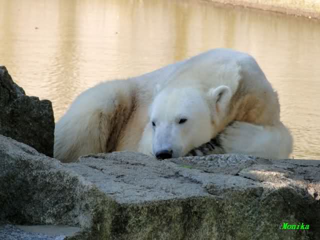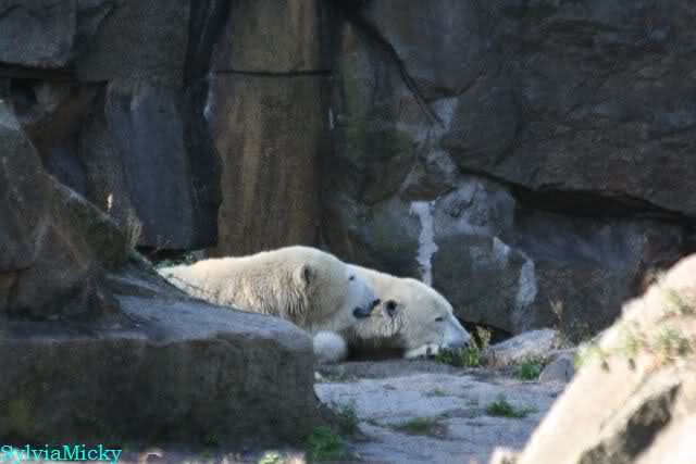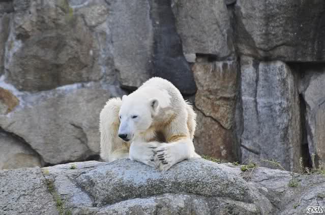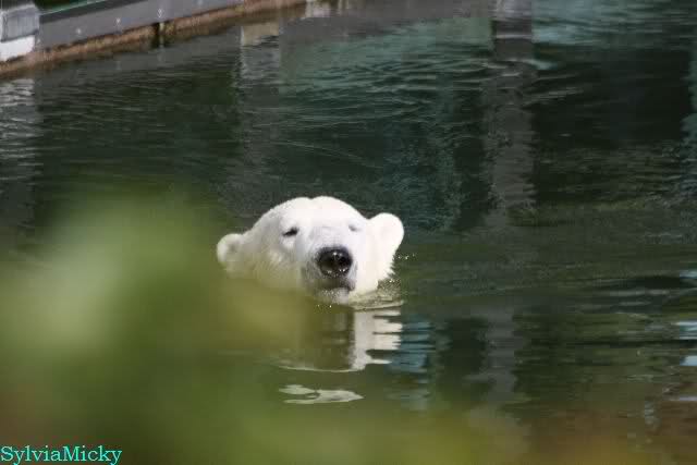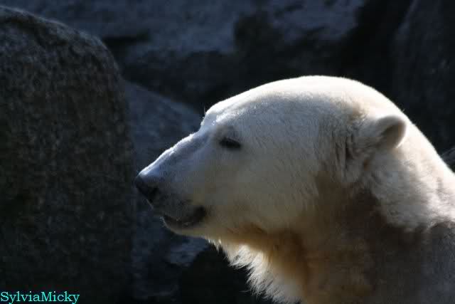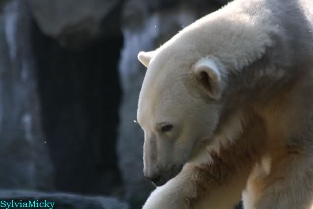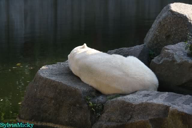 ...und in der äußersten unteren Ecke lag Knut noch als ich in den Zoo kam. Die Ohren angelegt, die Unterlippe zitterte, er machte einen nicht glücklichen Eindruck nicht nur auf die vielen auwärtigen Besucher. Besonders eine Knut Freundin aus Australien war regelrecht erschüttert. Ihr wurde gesagt das sie doch morgen nochmal vorbeischauen möge. Am Vomittag/Mittag war die Situation ja anders.