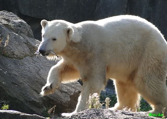 Die Mahlzeit fiel für Knut heute auch nicht sehr üppig aus. Er hatte gerade mal zwei Kartoffeln und ein Stück Fleisch verspeist, als Nancy um die Ecke kam. Knut ging dann gleich wieder nach oben. Frau Weckert warf ihm zwar noch zwei Fische hinterher, aber er hat nur einen gefunden.Kurze Zeit später gab es die erste Konfrontation mit Katjuscha. Knut stand unten und Kati oben. Knut ging sogar hinauf, aber dann brüllte er was das Zeug hielt. Ich gehe mal davon aus, dass Sylvia noch Fotos davon einstellen wird. Ich habe nur gefilmt (dachte ich zumindest), und habe wohl den Knopf nicht richtig gedrückt, jedenfalls gibt es nun leider kein Video.