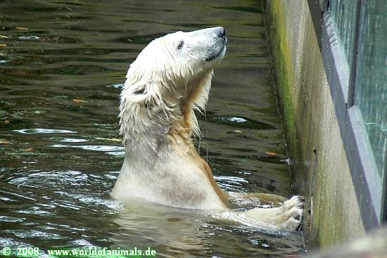 Dann kletterte er hoch und lief zu seinem Blechbaum. Dort stellte er sich auf die Hinterbeine und schubberte seinen Rücken am Blech. Wir hatten den Eindruck, dass Knut genau weiß, wie er am niedlichsten aussieht. Er machte possierliche Bewegungen mit seinen Tatzen, drückte sie an seine Brust und fuhr sich über den Kopf, als ob er sich vor uns verstecken wolle, so wie ein Kind. Dann schaute er sich Beifall heischend um, ob es auch alle gesehen haben.