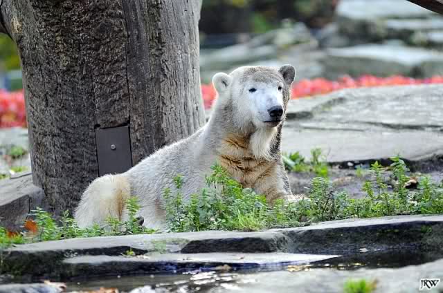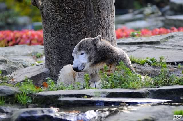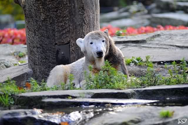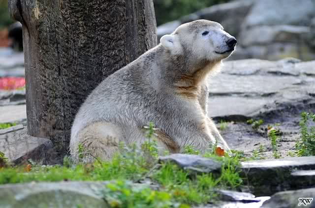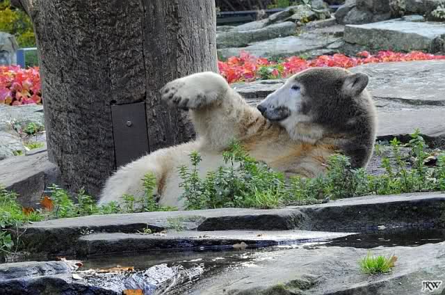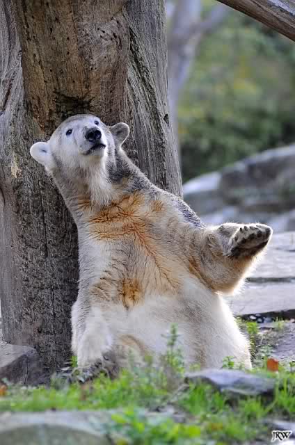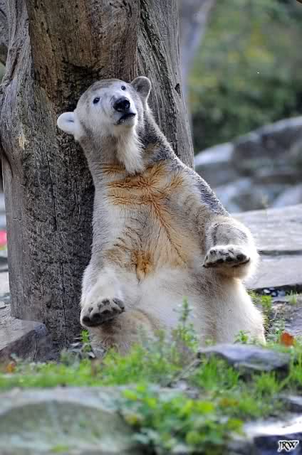 Dann fand Knut, wir seien genug unterhalten. Er ging zu den Baumstämmen, um sich dort ausgiebig alle möglichen Körperteile zu schubbern. Wir waren uns alle einig, sofort und freiwillig bei Knut das Rückenkraulen zu übernehmen.